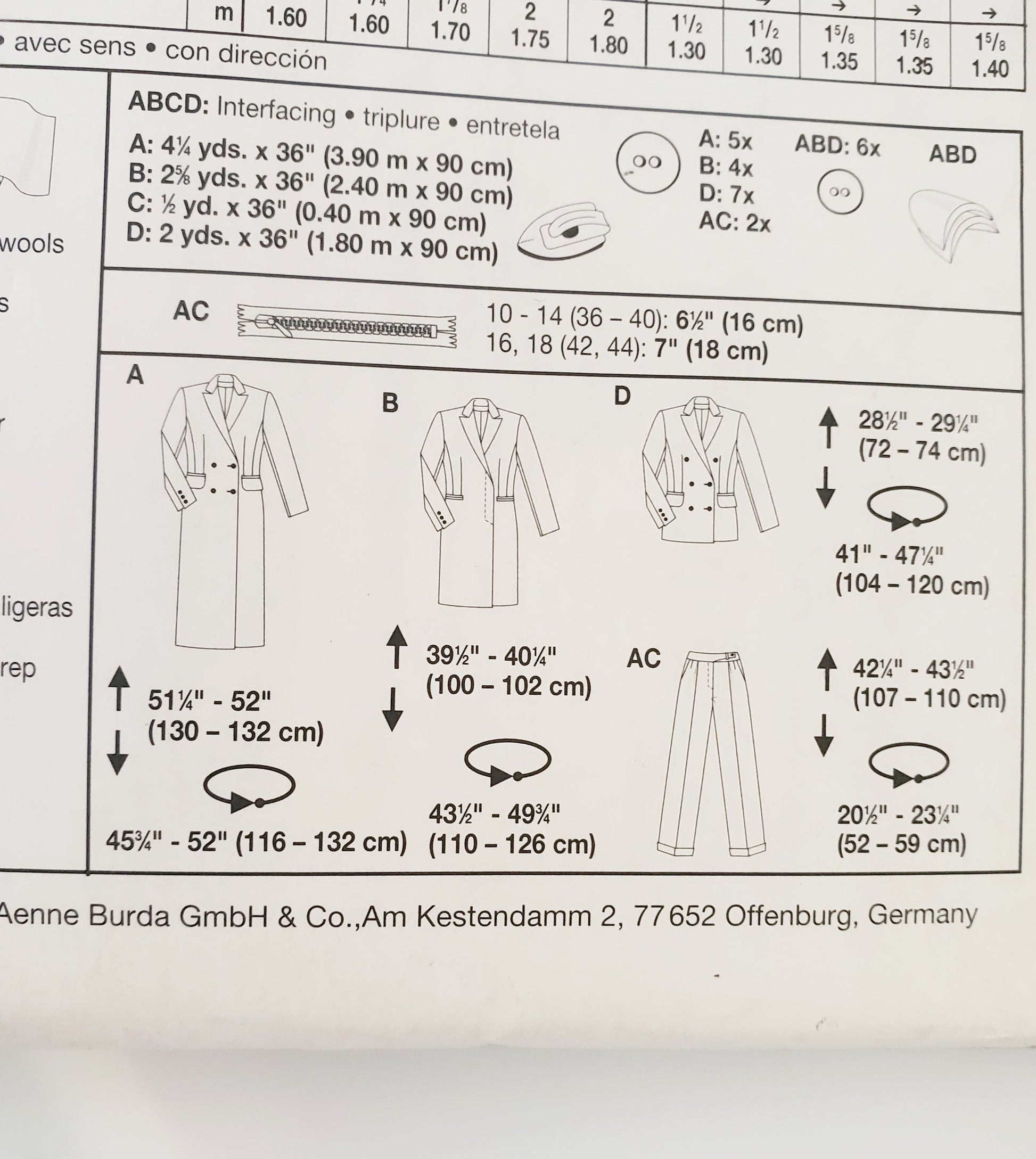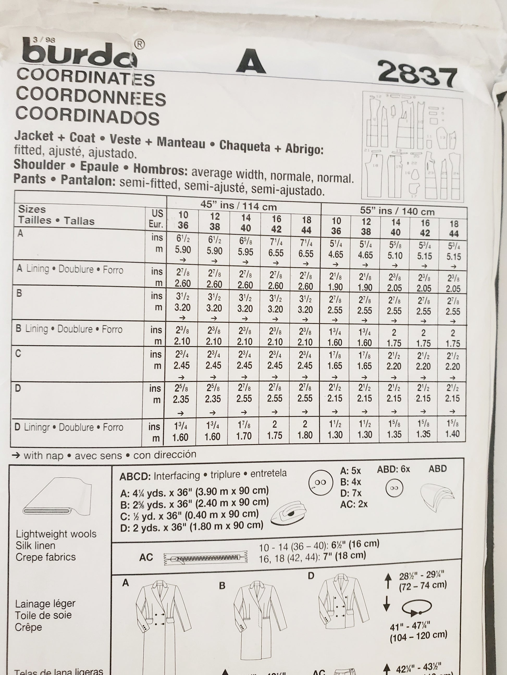 BURDA INTERNATIONAL, Sewing Pattern 2837, Pants, Jacket, Coat, Size 10-18