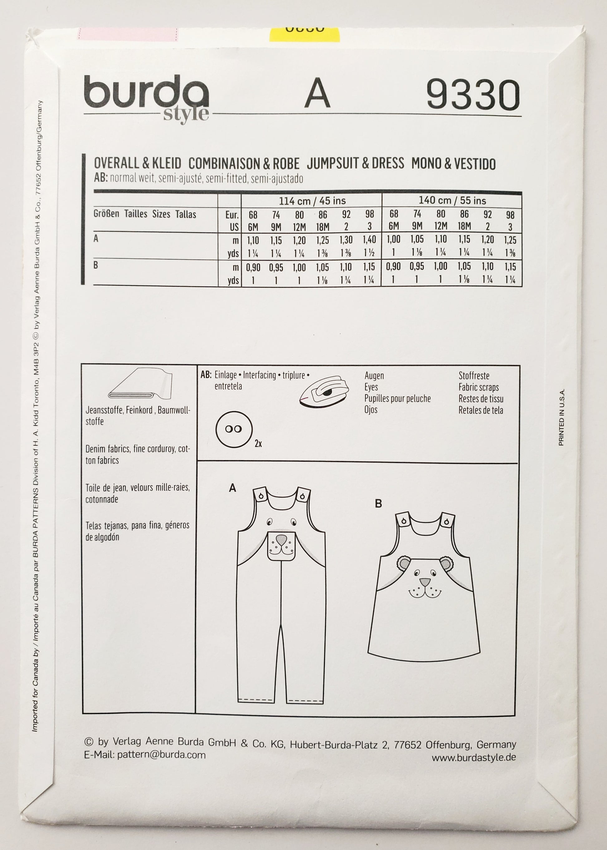 BURDA KIDS, Sewing Pattern 9330, Overalls, Jumpsuit, Dress, Kids, Toddlers, Size 6M-3