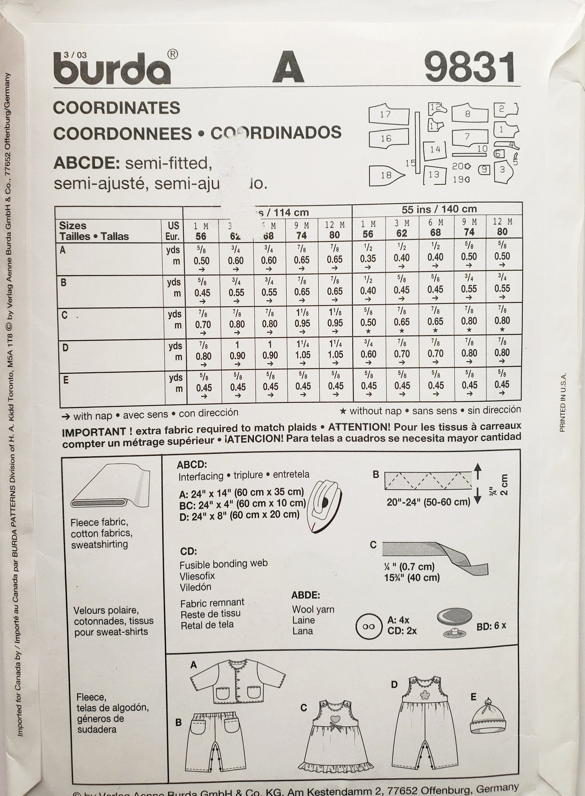 BURDA KIDS, Sewing Pattern ,9831, Beanie, Pants, Jacket, Dress, Romper, Baby, Infant, Size 1M-12M