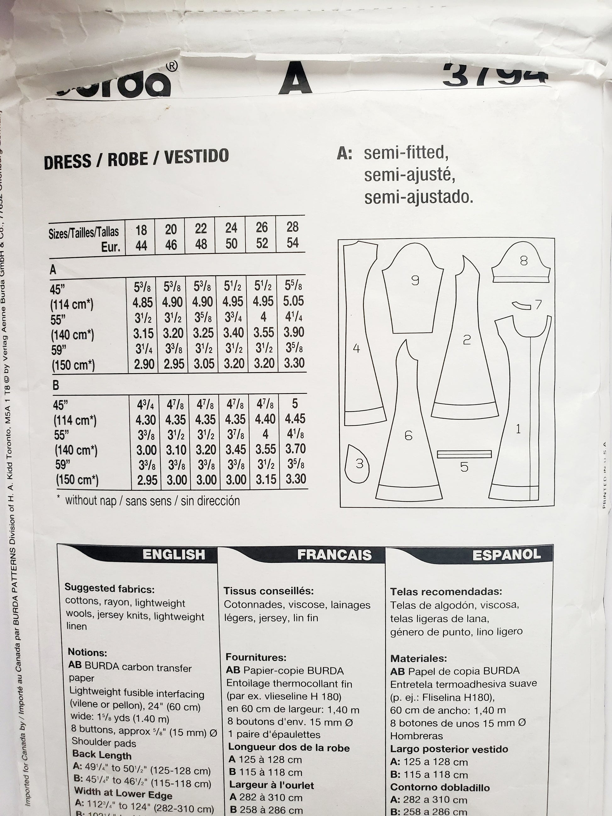 BURDA PLUS, Sewing Pattern 3794, Dress, Buttoned Dress, Short Sleeve, Long Sleeve, Size 18-28