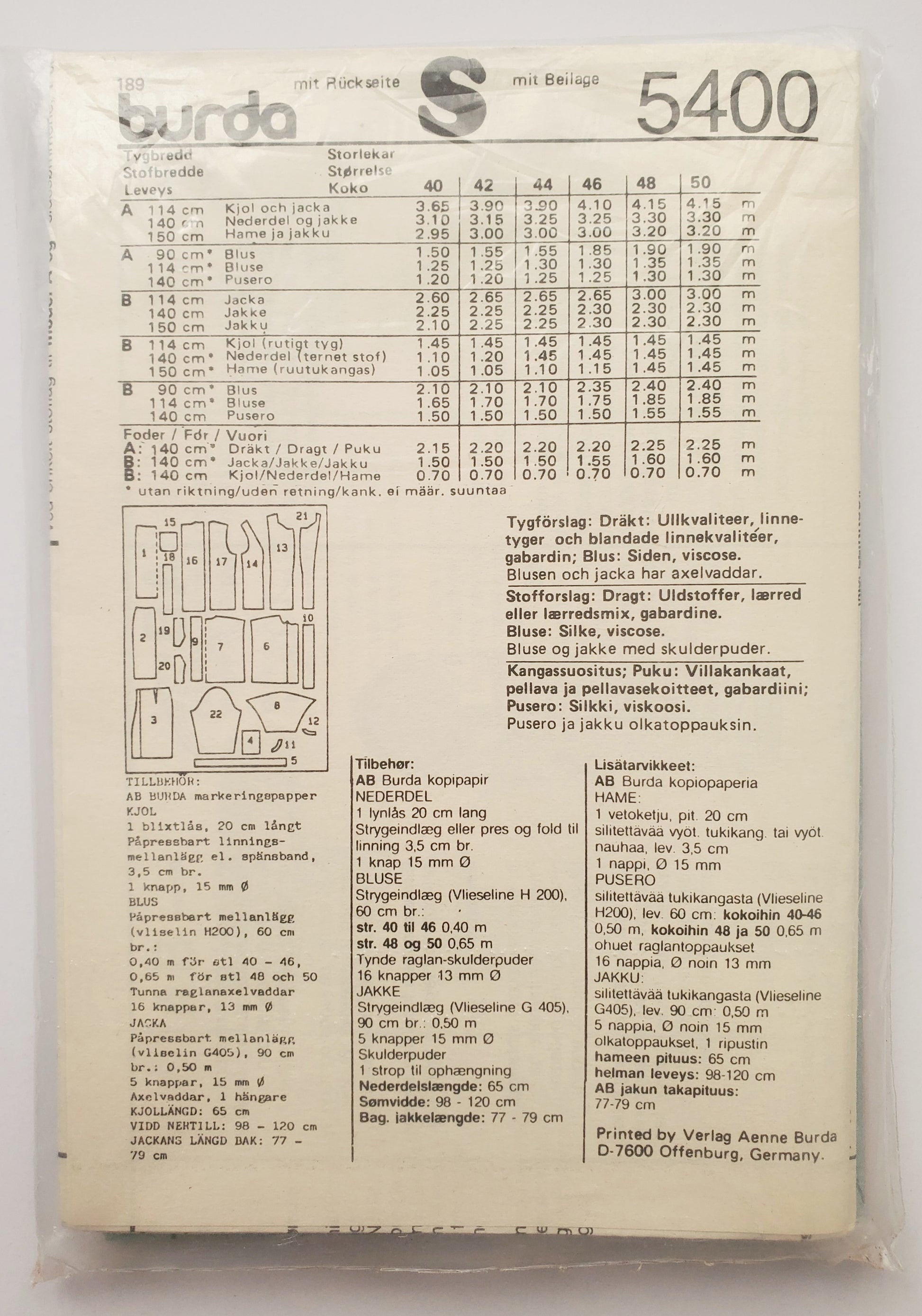 BURDA, Sewing Pattern 5400, Jacket, Skirt, Top, Size 14-20