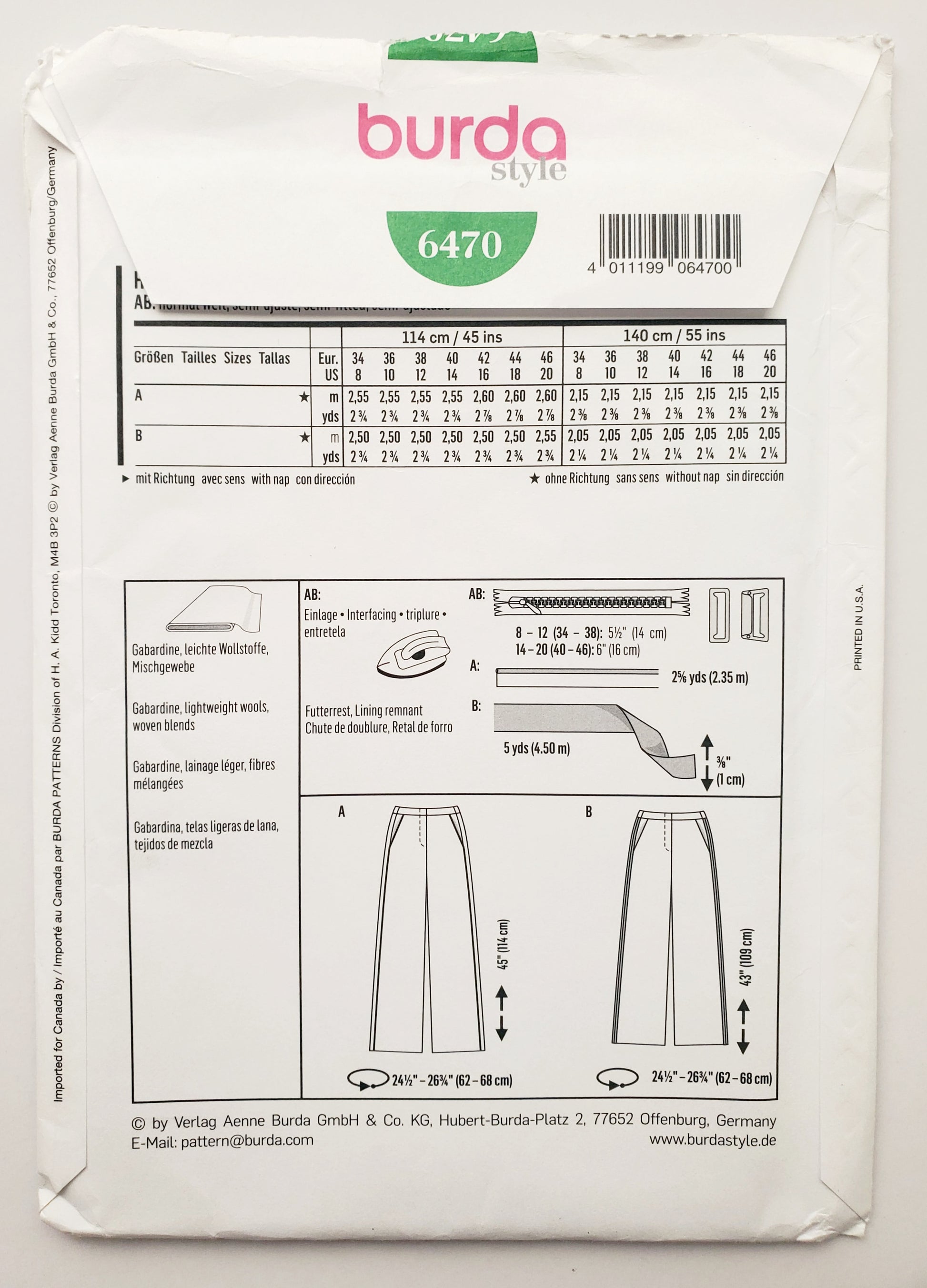 BURDA STYLE, Sewing Pattern 6470, Pants, Size 8-20