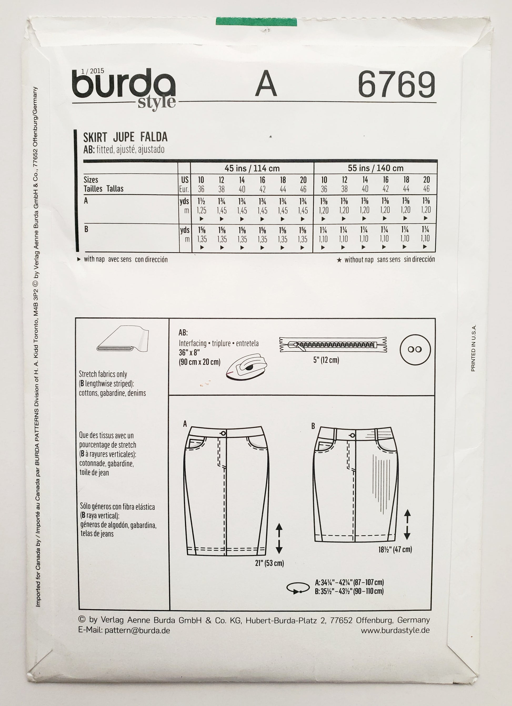 BURDA STYLE, Sewing Pattern 6769, Straight Short Skirt, Denim, Size 10-20