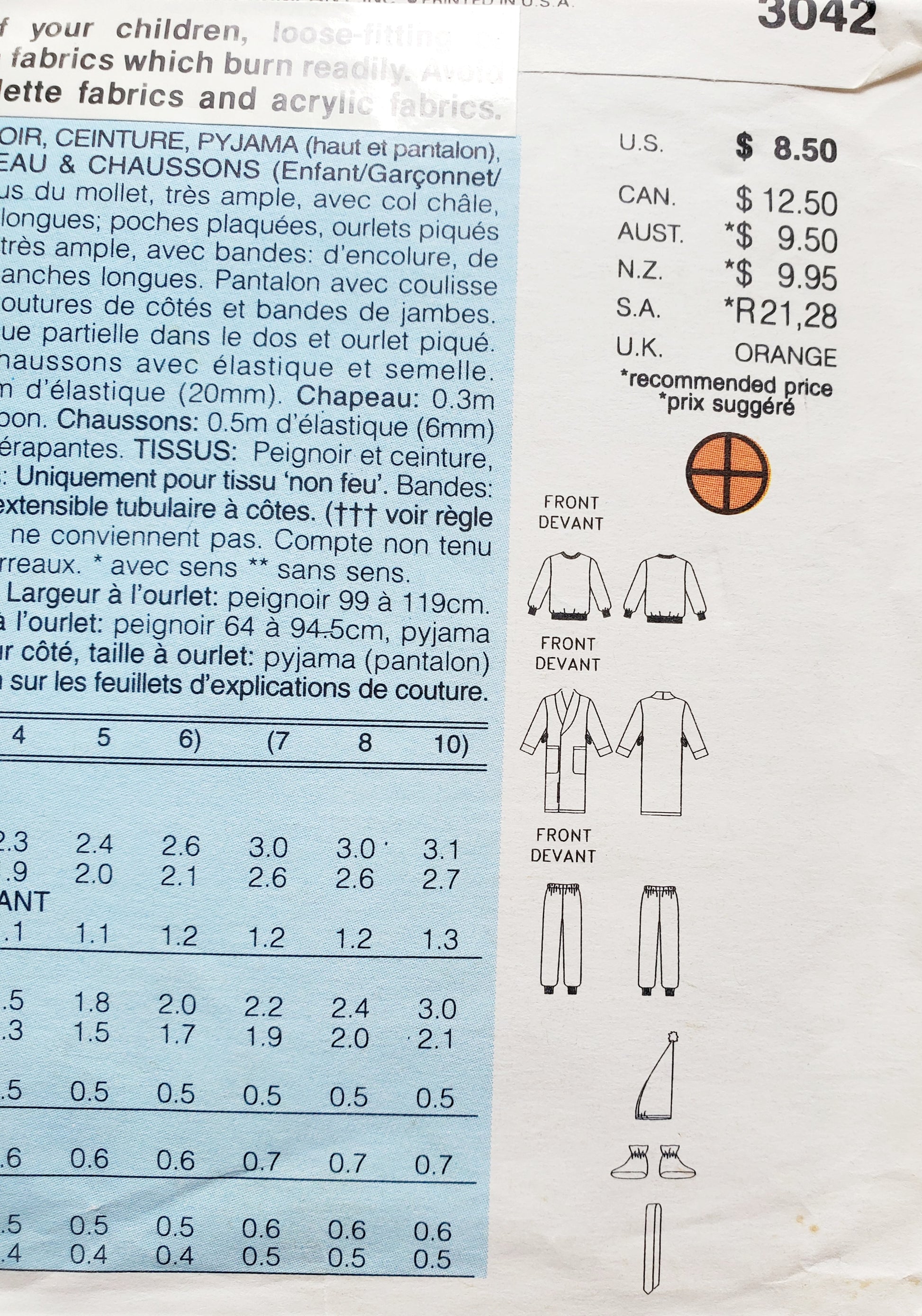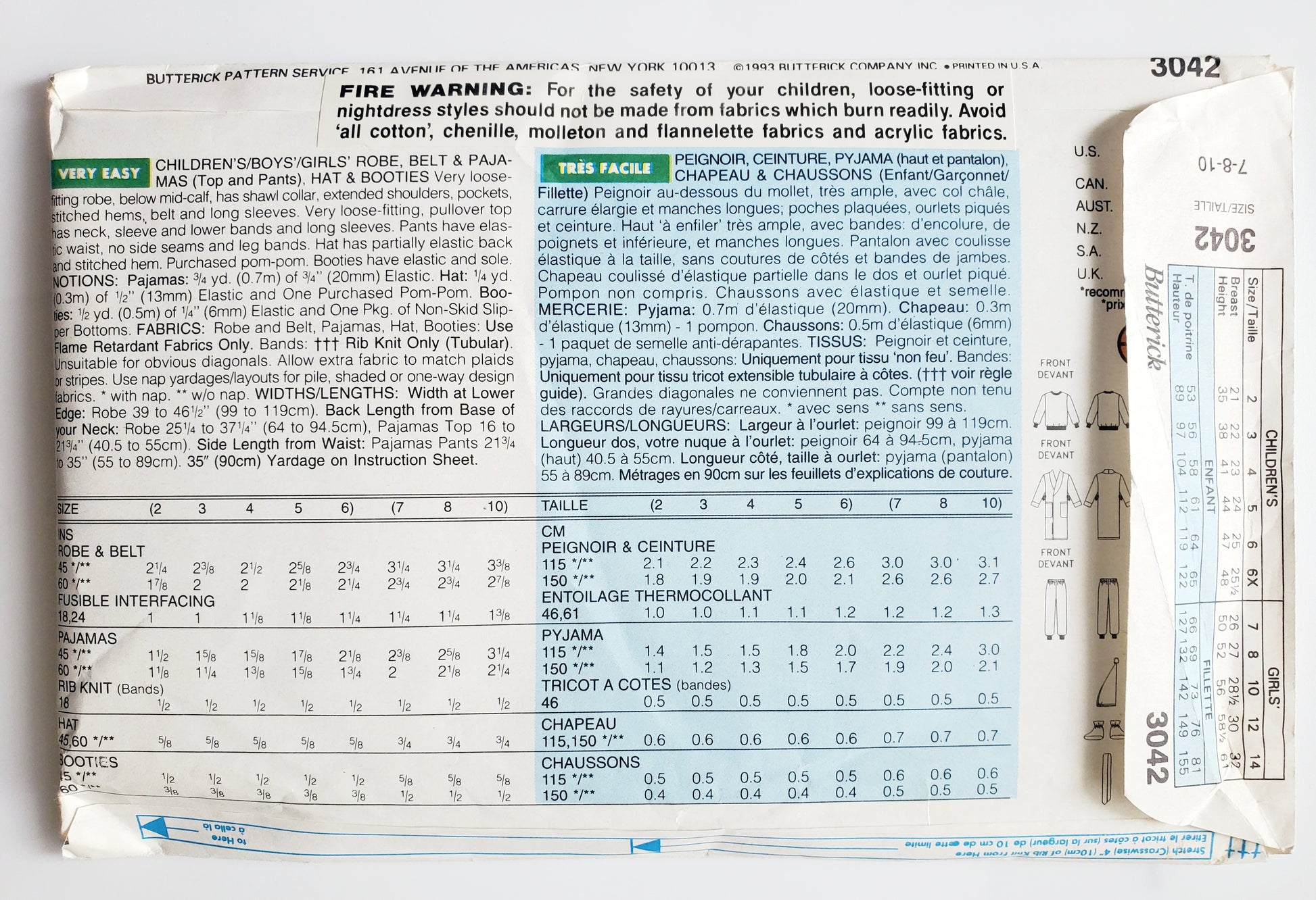 BUTTERICK Sewing Pattern 3042, Kids, Boys, Girls, Unisex, Robe, Pajamas, Hat, Boots, Size 7-10
