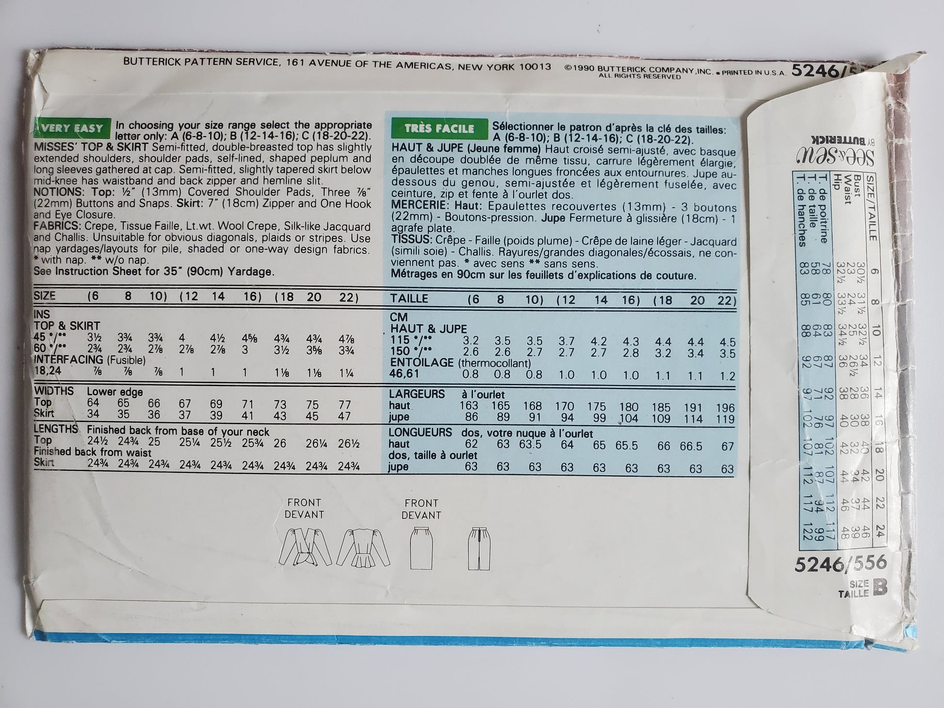 BUTTERICK Sewing Pattern 5246 556, Skirt, Top, Peplum, 90's, Size 12-16
