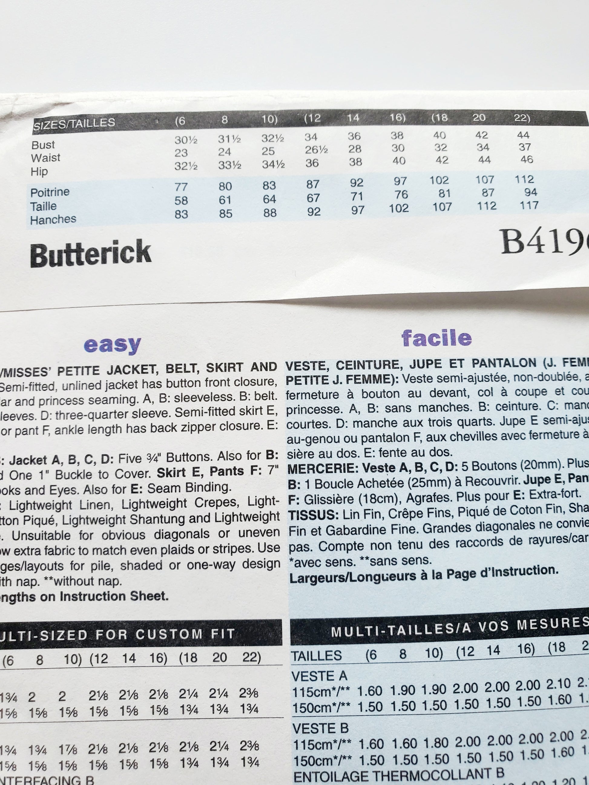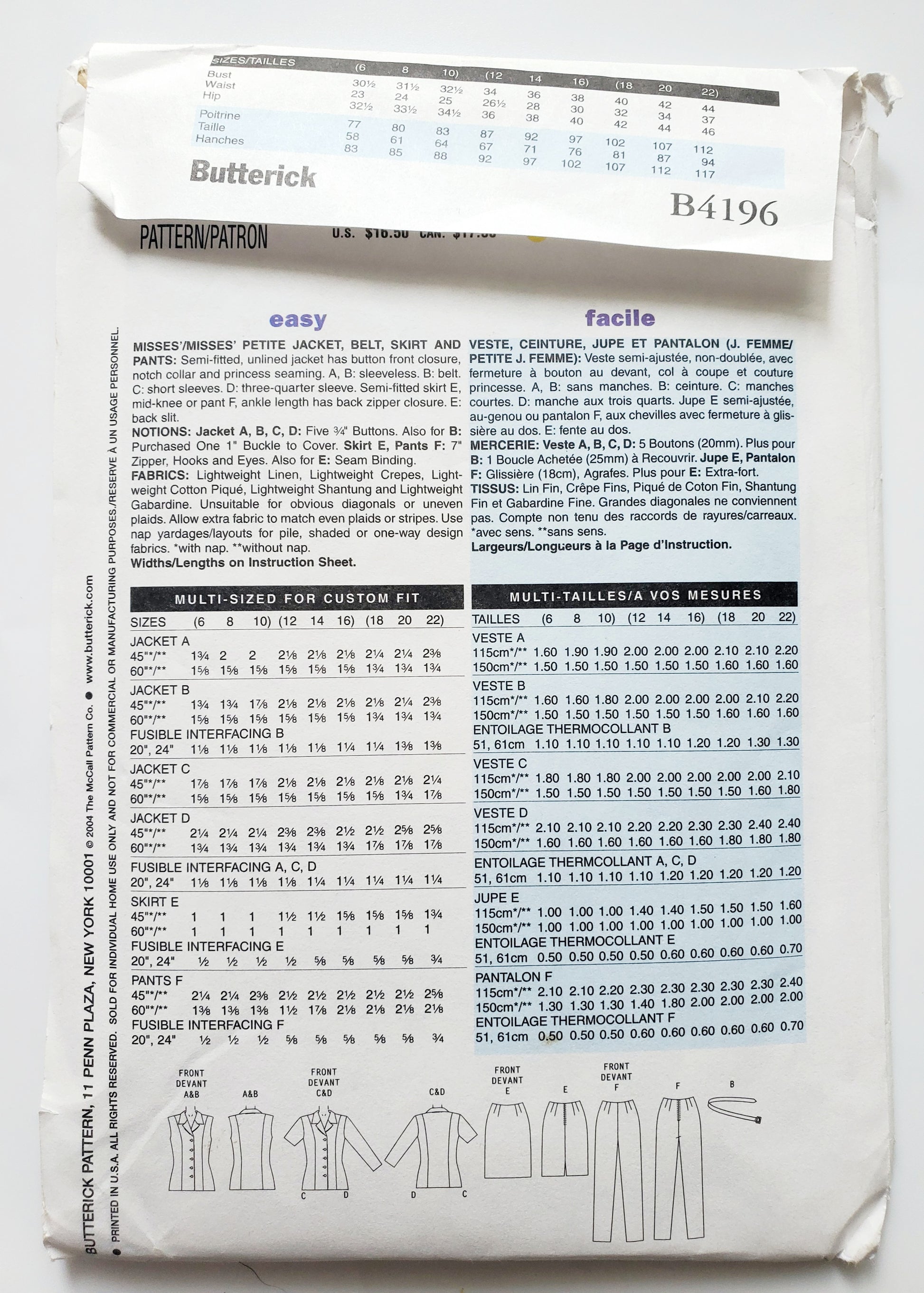 BUTTERICK Sewing Pattern B4196, Jacket, Belt, Skirt, Pants, Notch Collar, Size 12-16