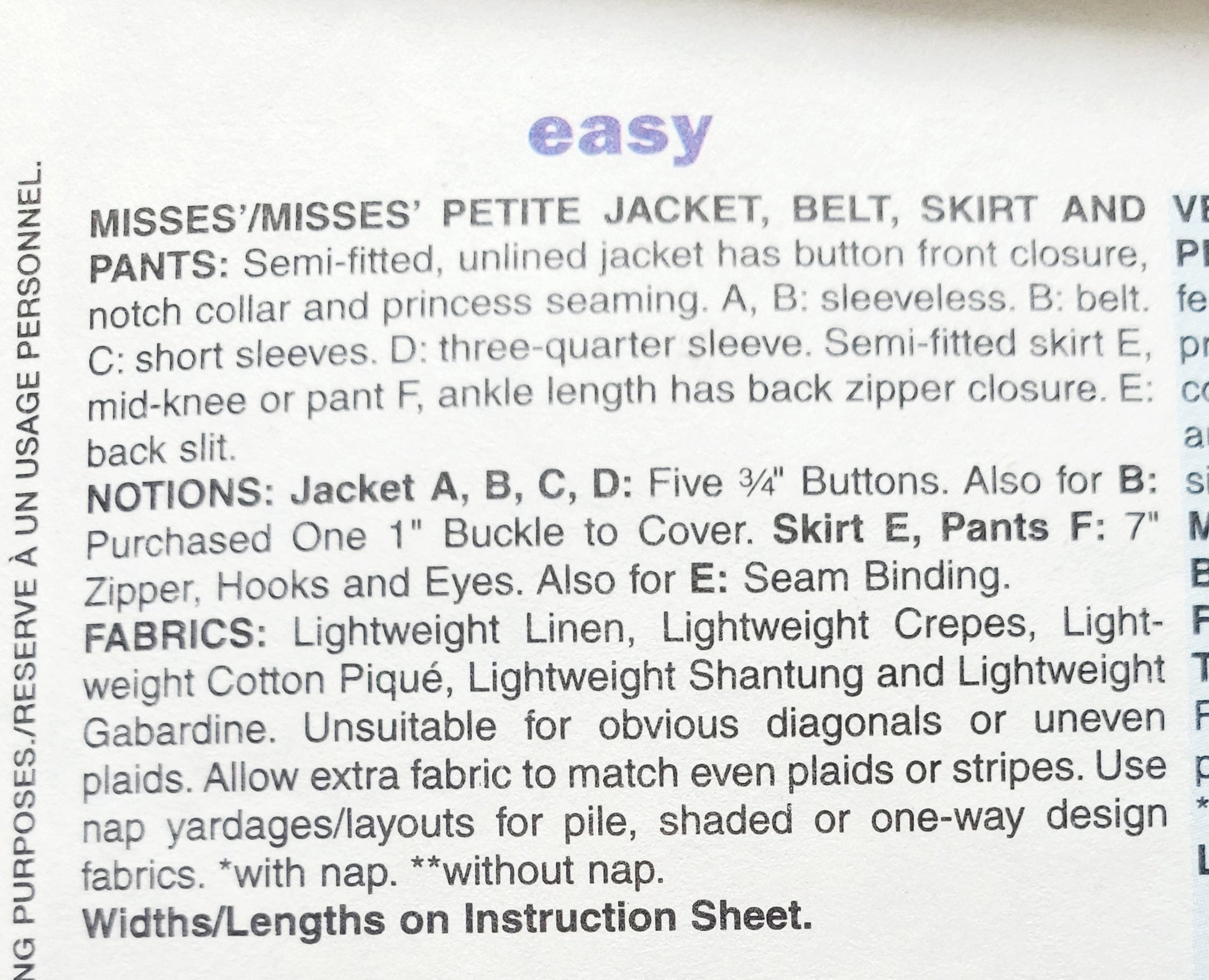 NOTIONS: Jacket A, B, C, D: Five ¾" Buttons. Also for B: Purchase One 1" Buckle to Cover. Skirt E, Pants F: 7" Zipper, Hooks and Eyes. Also for E: Seam Binding.