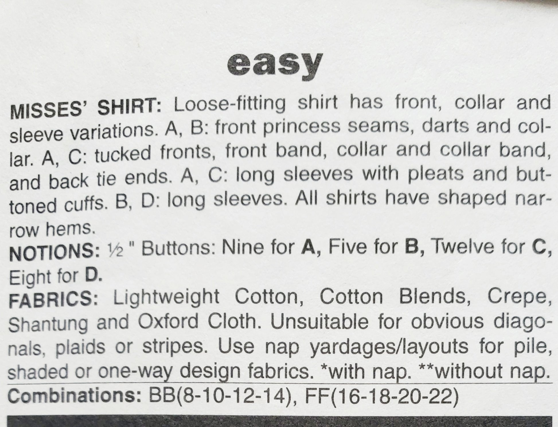 FABRICS: Lightweight Cotton, Cotton Blends, Crepe, Shantung and Oxford Cloth. Unsuitable for obvious diagonals, plaids or stripes. Use nap yardages/layouts for pile, shaded or one-way design fabrics. *with nap. **without nap.