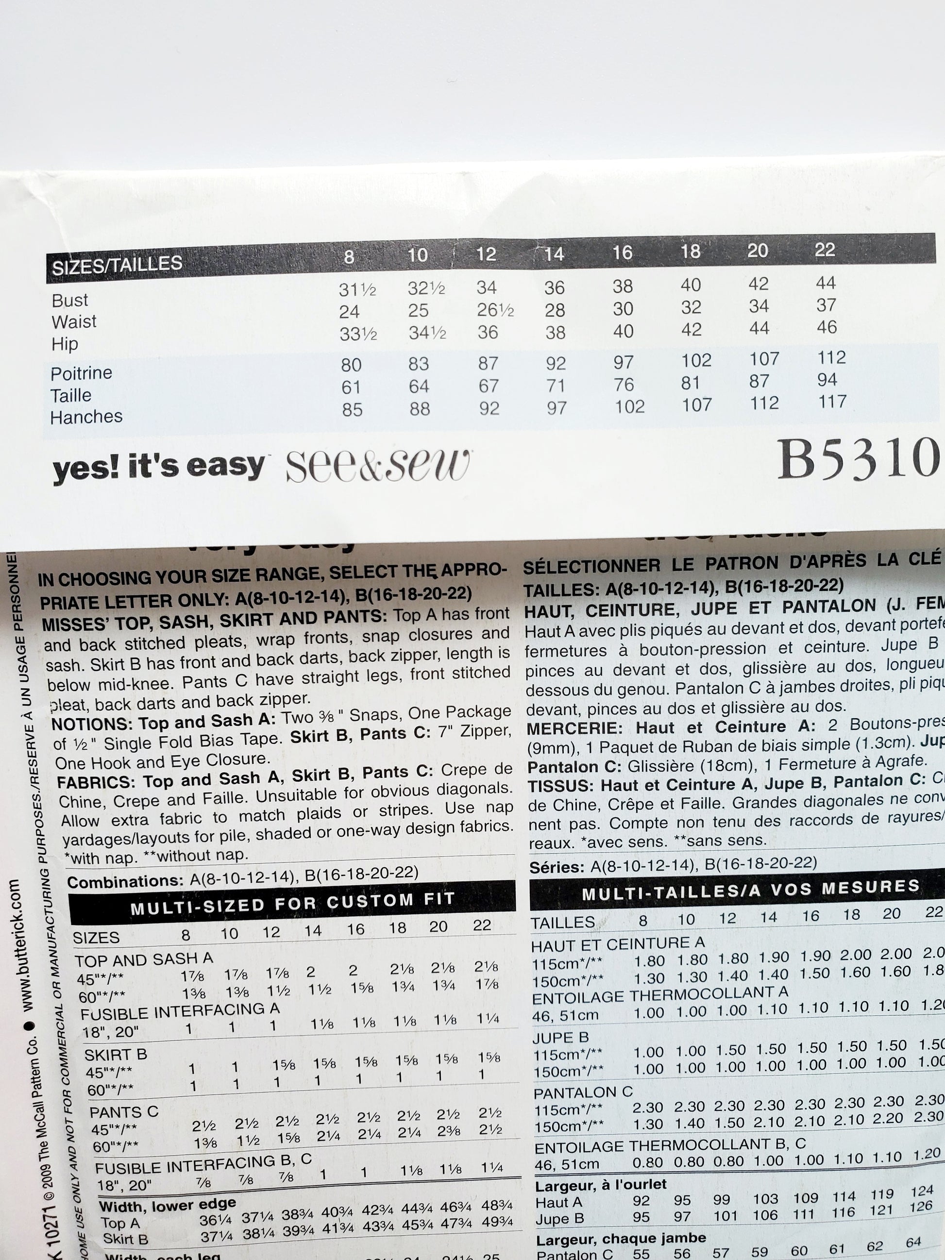 BUTTERICK Sewing Pattern B5310, Top, Skirt, Pants, Sash, Size 16-22