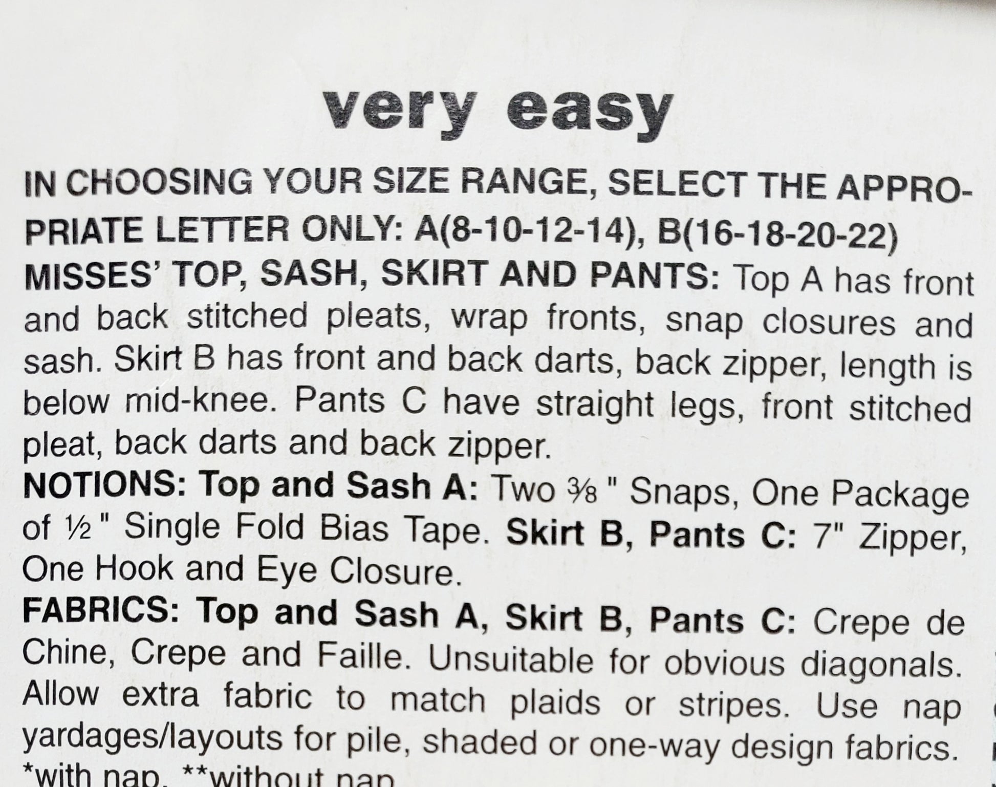 FABRICS: Top and Sash A, Skirt B, Pants C: Crepe de Chine, Crepe and Faille. Unsuitable for obvious diagonals. Allow extra fabric to match plaids or stripes. Use nap yardages/layouts for pile, shaded or one-way design fabrics.