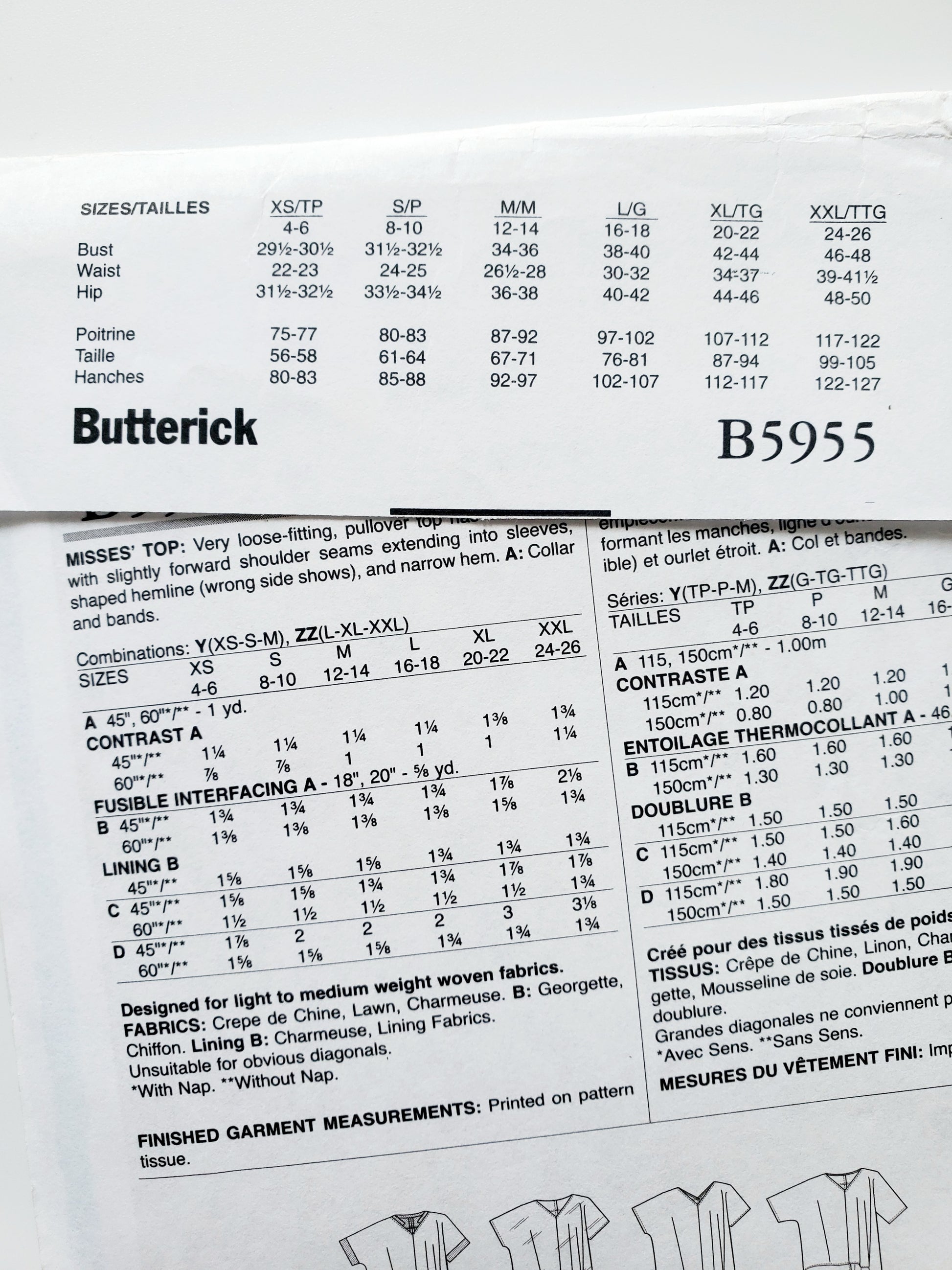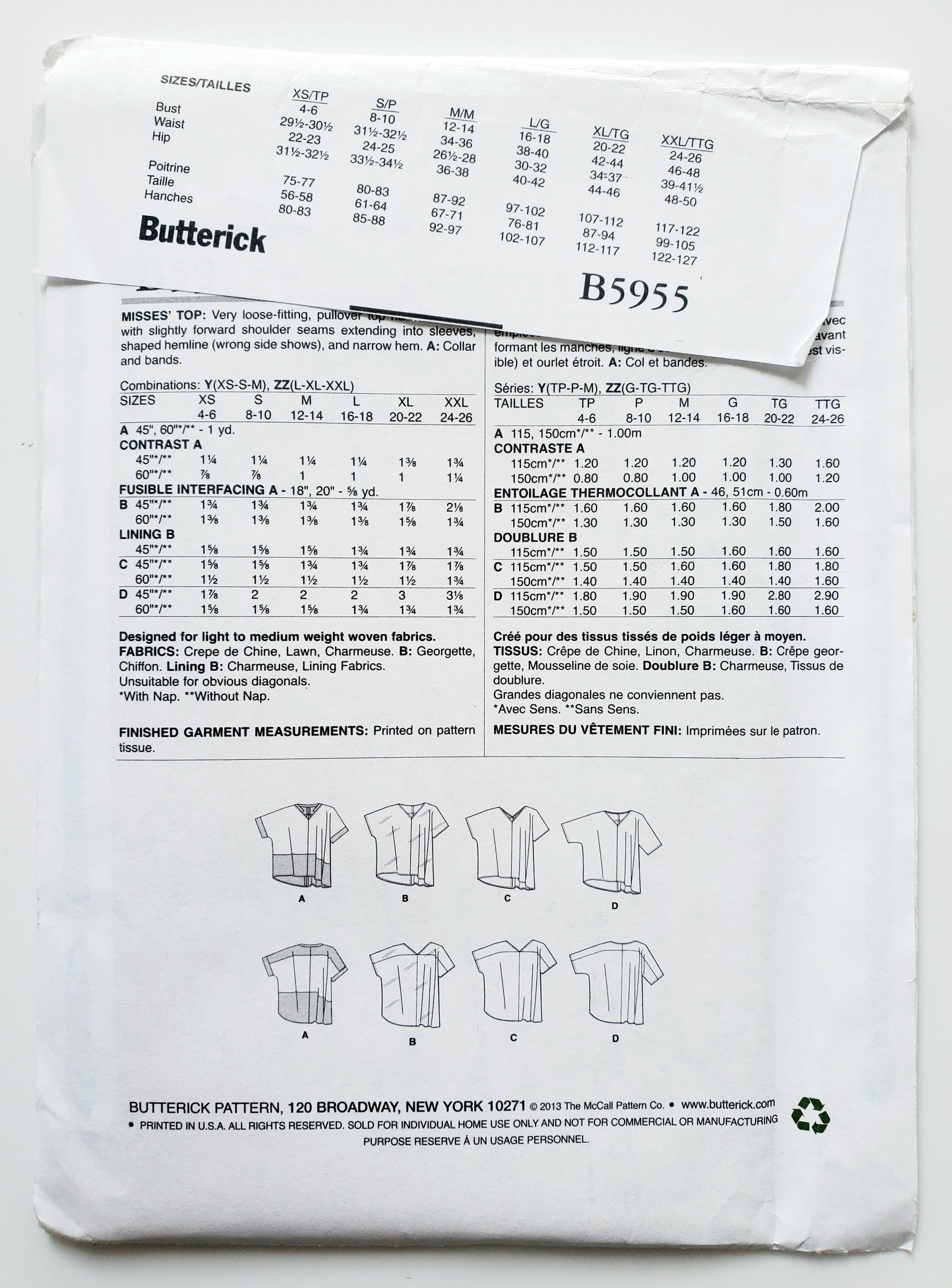 BUTTERICK Sewing Pattern B5955, Top, Loose Fitting Top, Back Yoke, Size 4-14