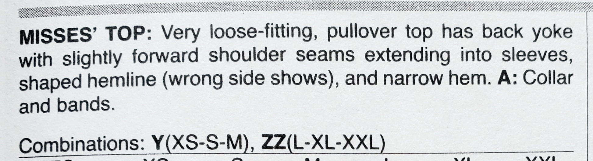 MISSES' TOP: Very loose-fitting, pullover top has back yoke with slightly forward shoulder seams extending into sleeves, shaped hemline (wrong side shows), and narrow hem. A: Collar and bands.