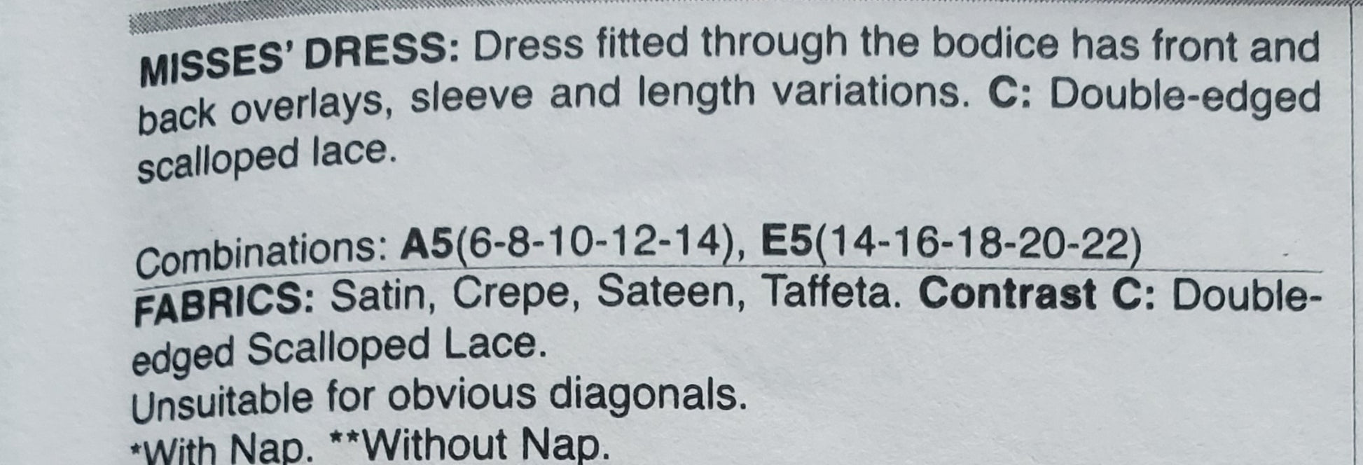 FABRICS: Satin, Crepe, Sateen, Taffeta. Contrast C: Double-edged Scalloped Lace.