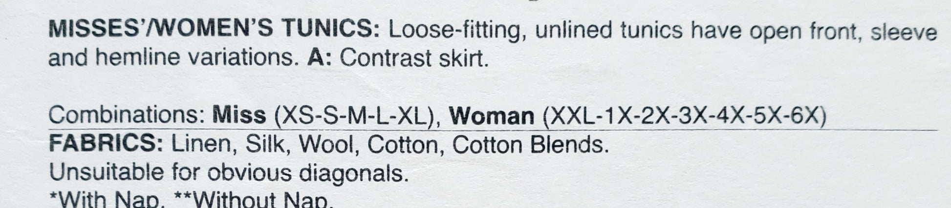 MISSES/WOMEN'S TUNICS: Loose-fitting, unlined tunics have open front, sleeve and hemline variations. A: Contrast skirt.