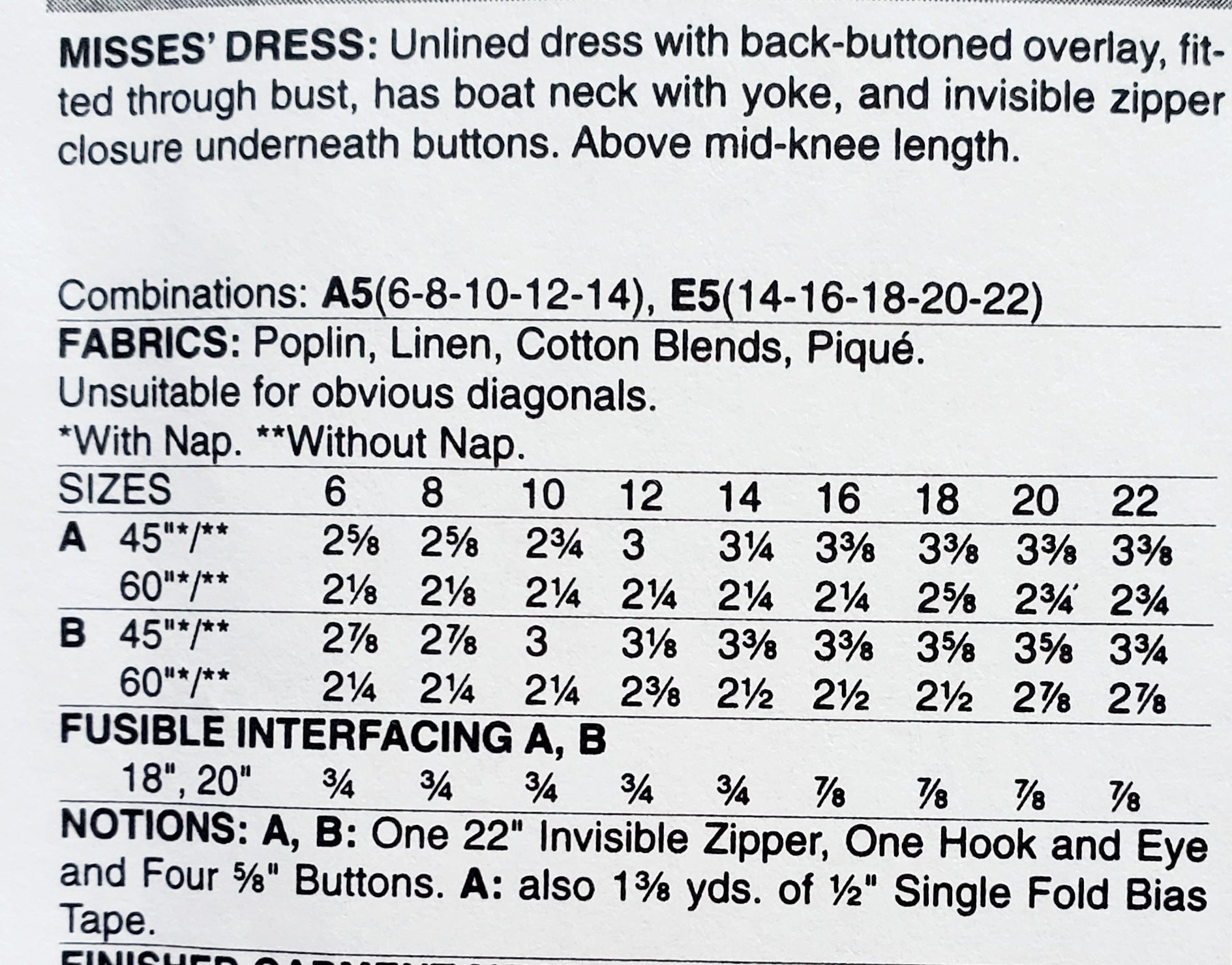 NOTIONS: A, B: One 22" Invisible Zipper, One Hook and Eye and Four 1/4" Buttons. A: also 1 1/4 yds. of 1/4" Single Fold Bias Tape.