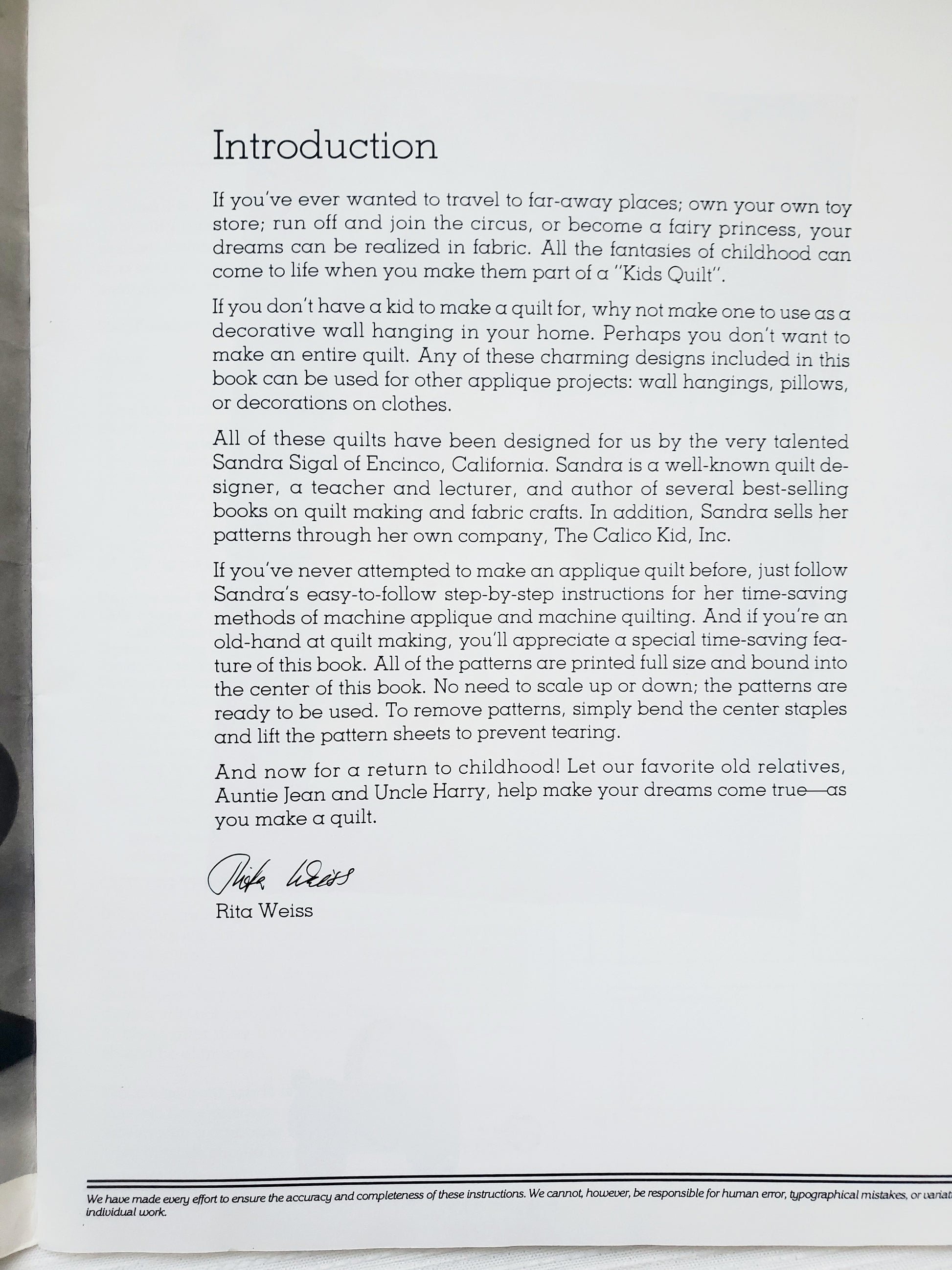 Quilts designed by Sanda Sigal of Encinco, California. Her company was 'The Calico Kid, Inc'.