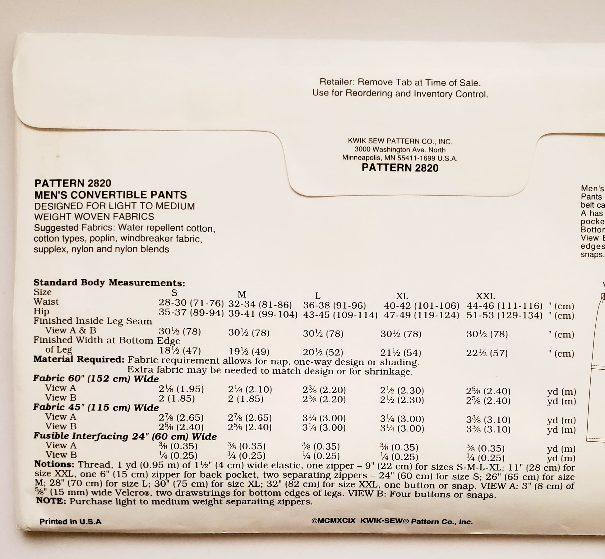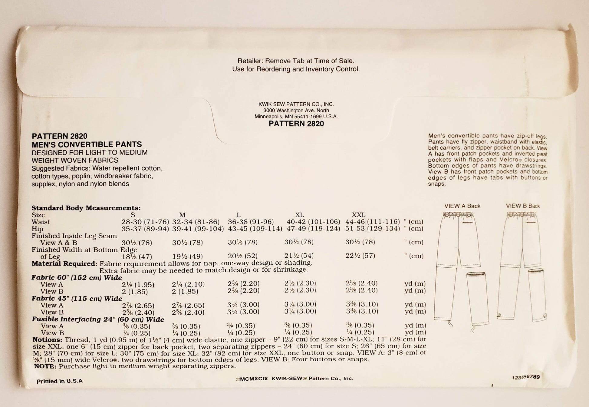 Notions: Thread, 1 yd (0.95 m) of 1½" (4 cm) wide elastic, one zipper – 9" (22 cm) for sizes S-M-L-XL; 11" (28 cm) for size XXL, one 6" (15 cm) zipper for back pocket, two separating zippers – 24" (60 cm) for size S; 26" (65 cm) for size M; 28" (70 cm) for size L; 30" (75 cm) for size XL; 32" (82 cm) for size XXL, one button or snap. VIEW A: 3" (8 cm) of ⅝" (15 mm) wide Velcro, two drawstrings for bottom edges of legs. VIEW B: Four buttons or snaps. NOTE: Purchase light to medium weight separating zippers