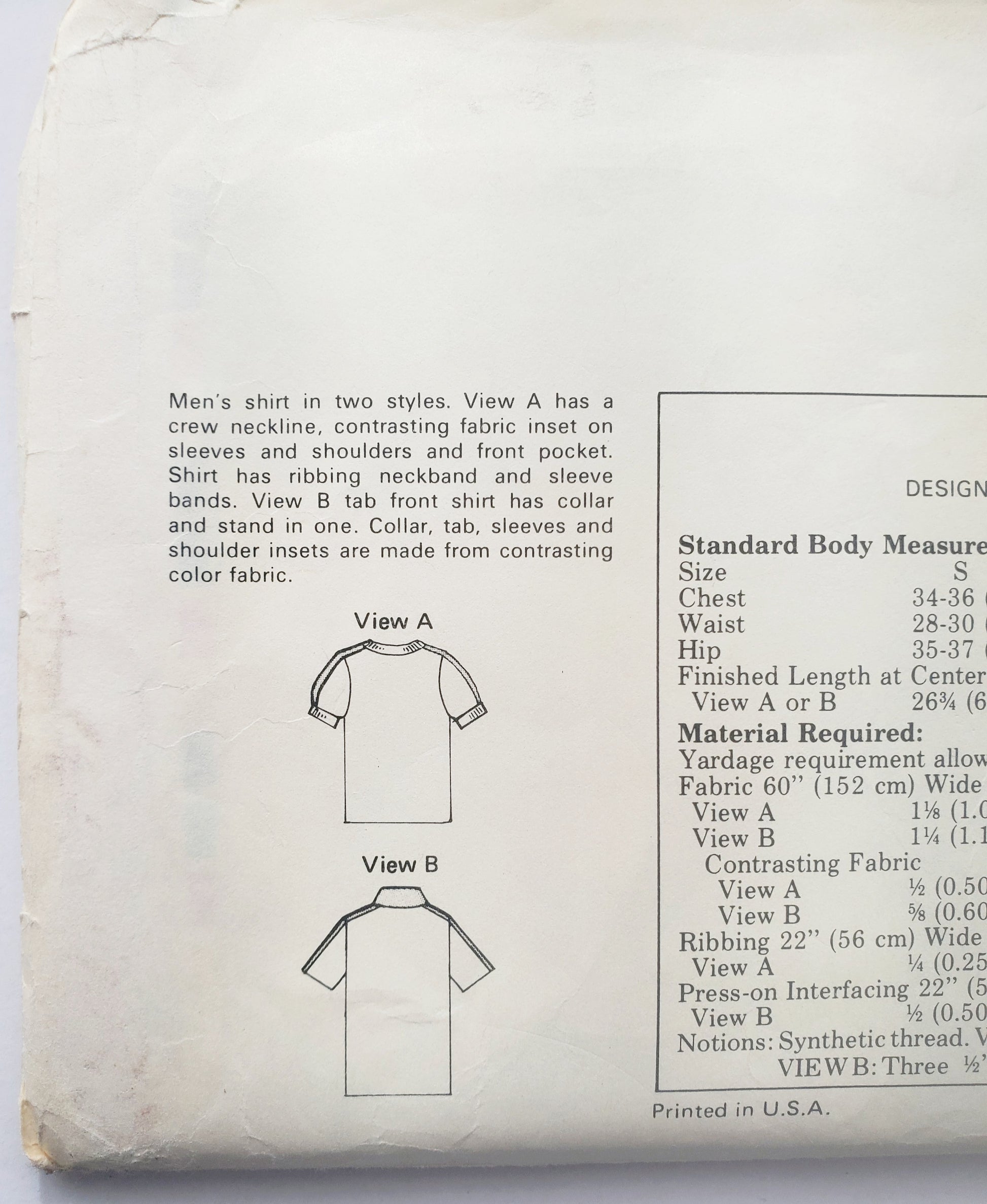 Men's shirt in two styles. View A has a crew neckline, contrasting fabric inset on sleeves and shoulders and front pocket. Shirt has ribbing neckband and sleeve bands. View B tab front shirt has collar and stand in one. Collar, tab, sleeves and shoulder insets are made from contrasting color fabric