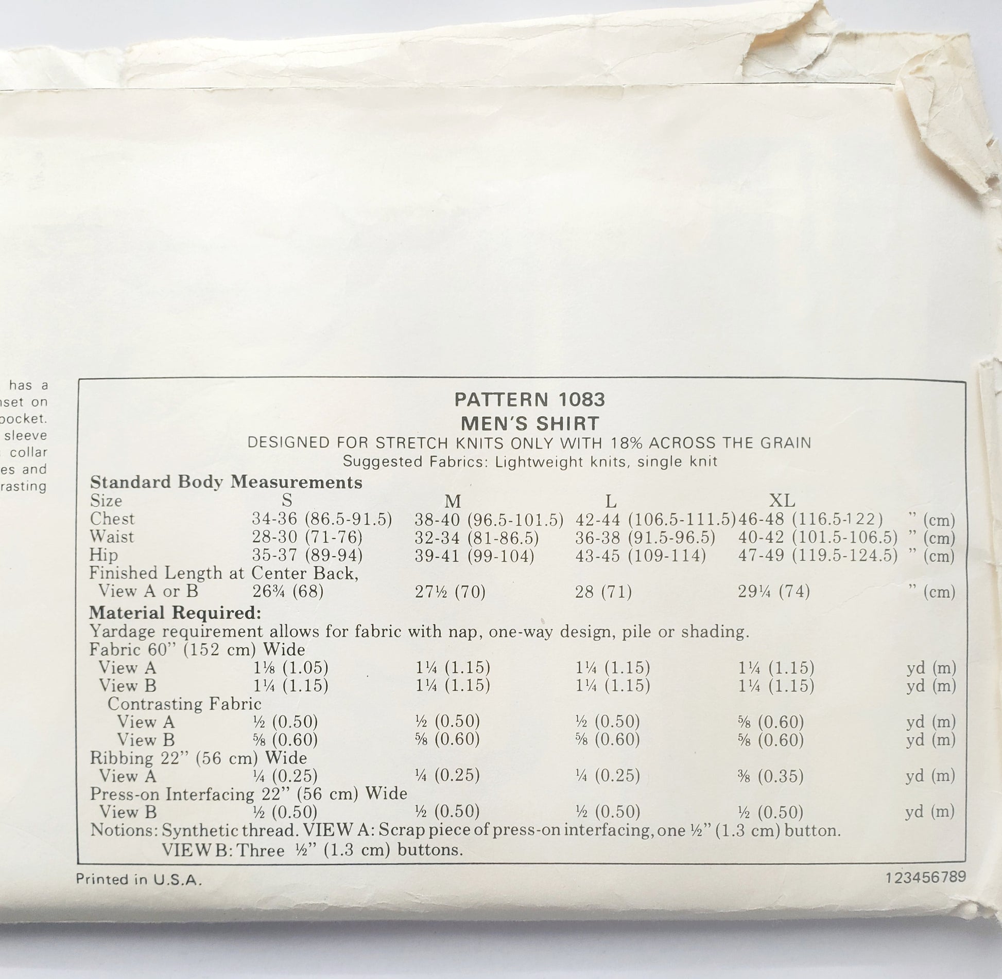 PATTERN 1083 MEN'S SHIRT DESIGNED FOR STRETCH KNITS ONLY WITH 18% ACROSS THE GRAIN. Suggested Fabrics: Lightweight knits, single knit