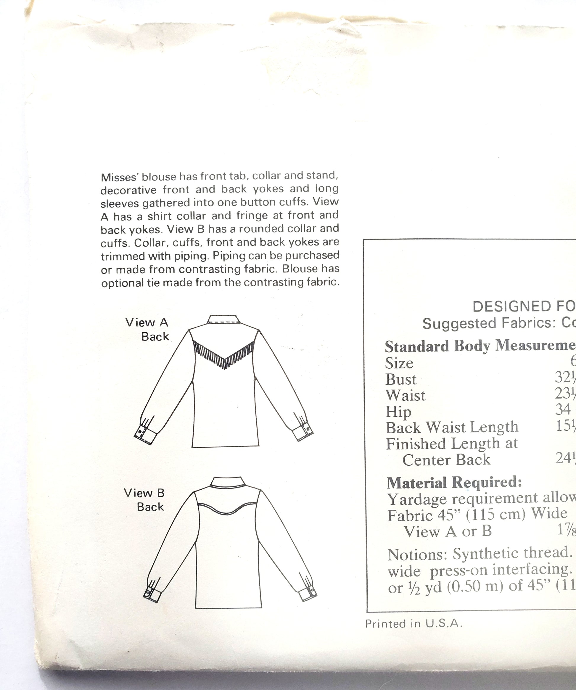 Misses' blouse has front tab, collar and stand, decorative front and back yokes and long sleeves gathered into one button cuffs. View A has a shirt collar and fringe at front and back yokes. View B has a rounded collar and cuffs. Collar, cuffs, front and back yokes are trimmed with piping. Piping can be purchased or made from contrasting fabric. Blouse has optional tie made from the contrasting fabric