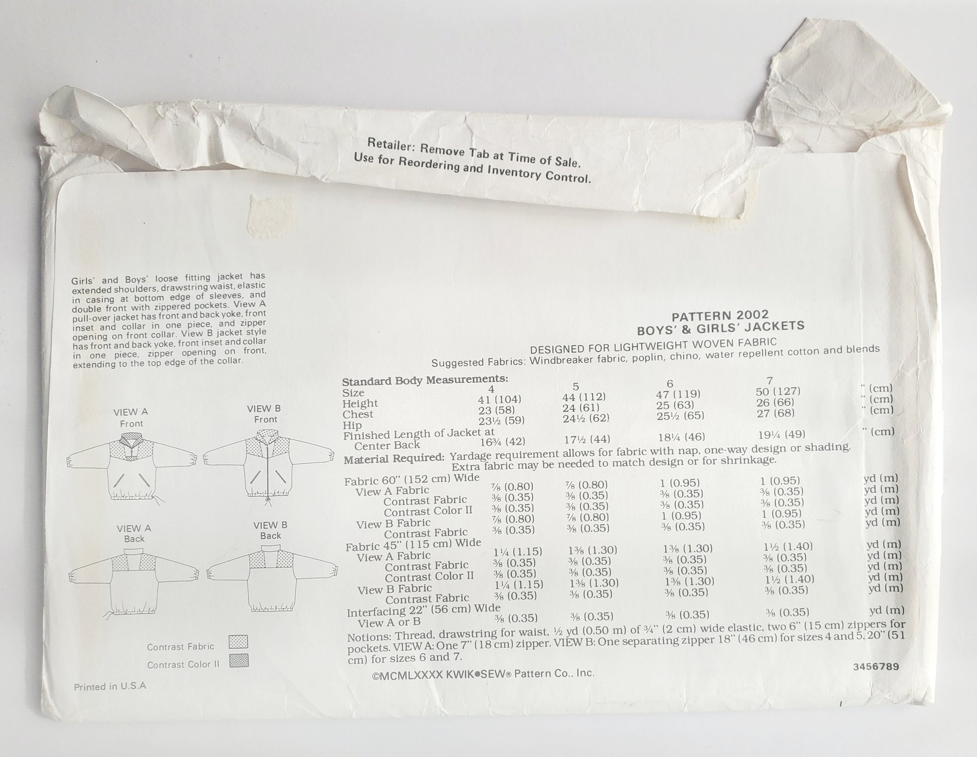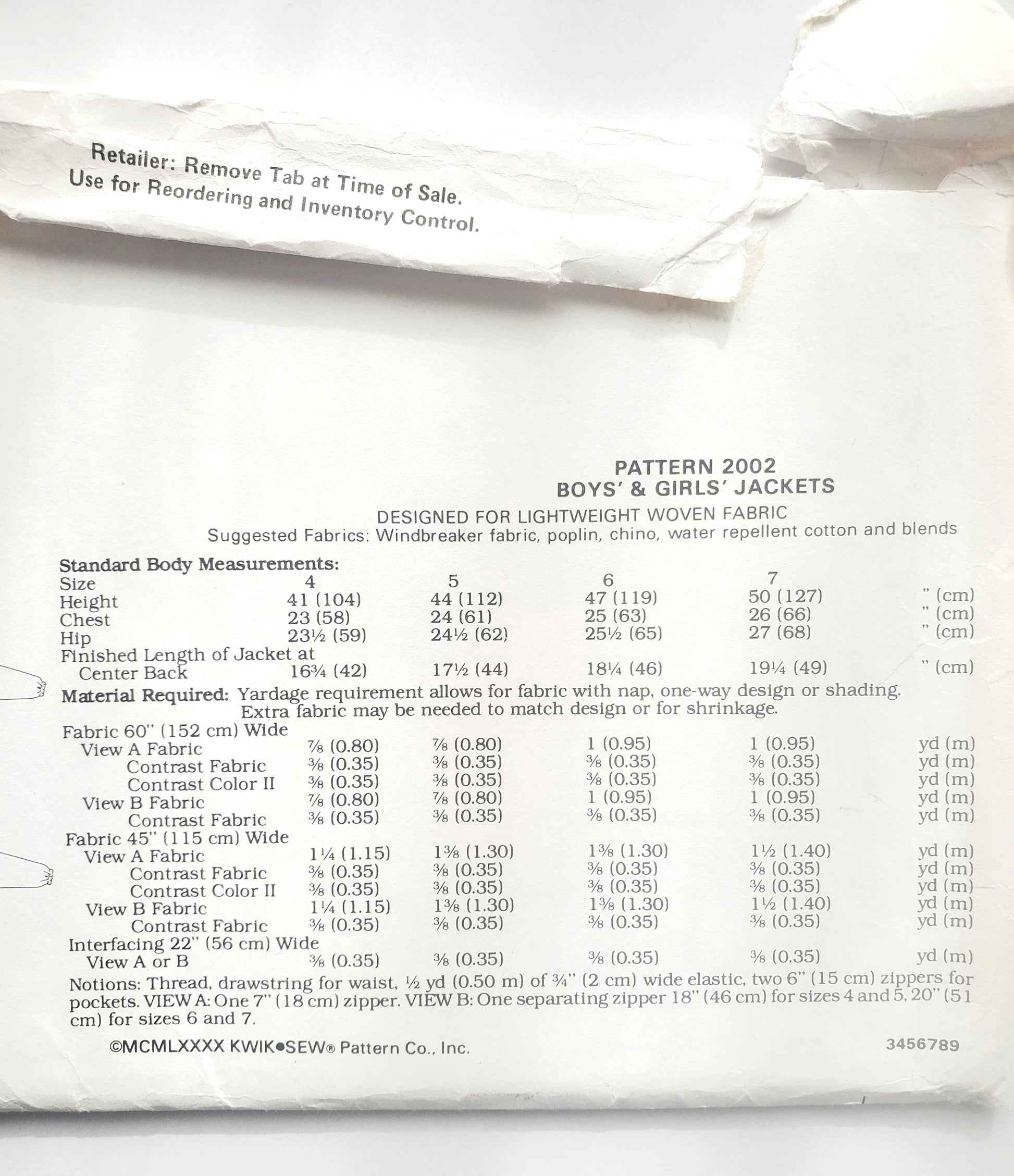 KWIK SEW Sewing Pattern, 2002, Kids, Boy, Girls, Jacket, Loose-Fitting, Size 4-7