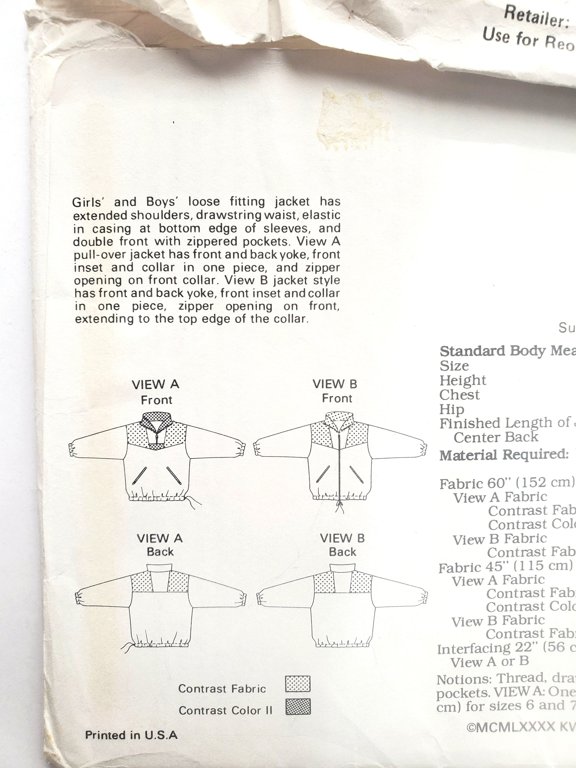 Girls' and Boys' loose fitting jacket has extended shoulders, drawstring waist, elastic in casing at bottom edge of sleeves, and double front with zippered pockets. View A pull-over jacket has front and back yoke, front inset and collar in one piece, and zipper opening on front collar. View B jacket style has front and back yoke, front inset and collar in one piece, zipper opening on front, extending to the top edge of the collar.
