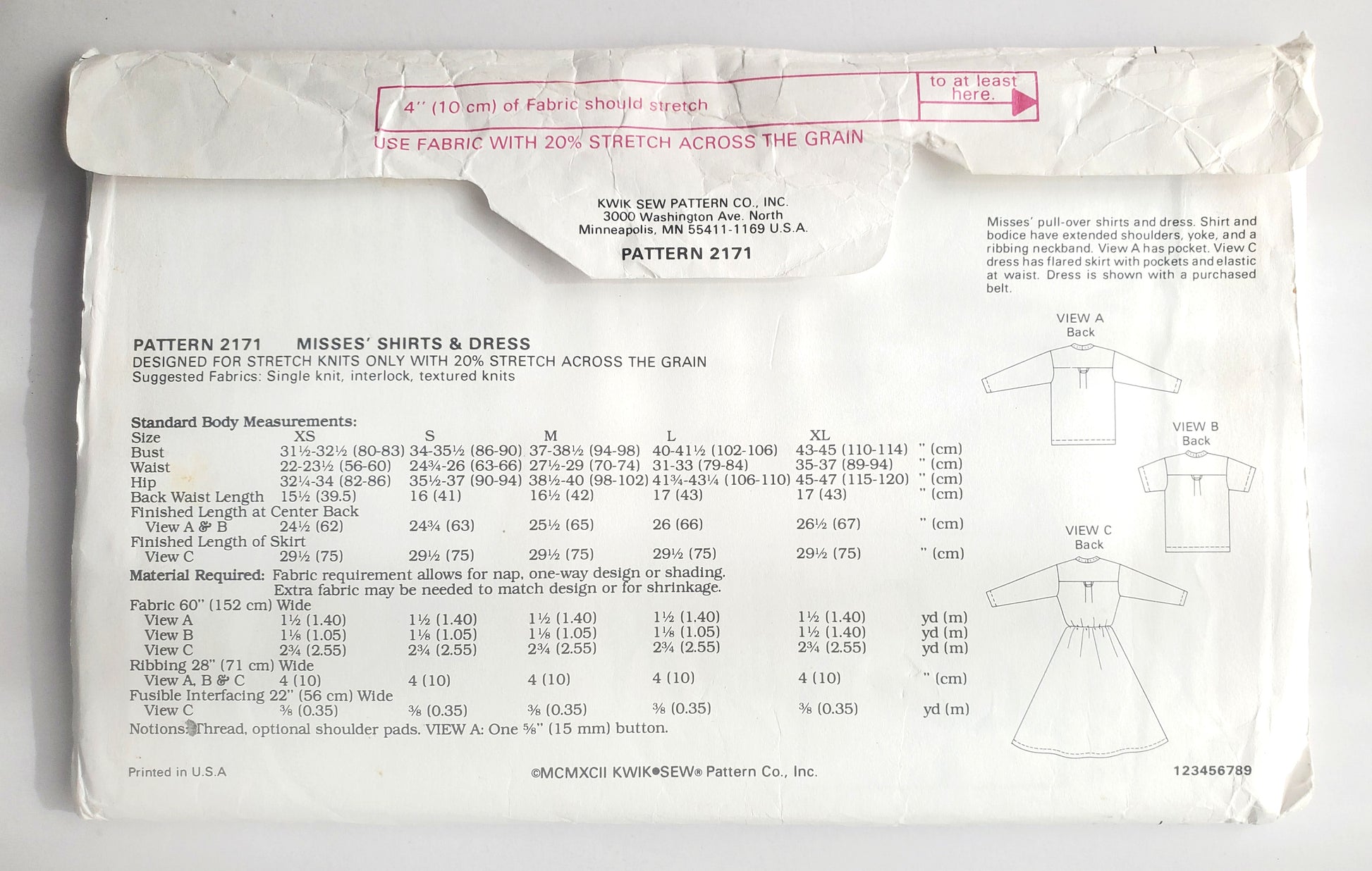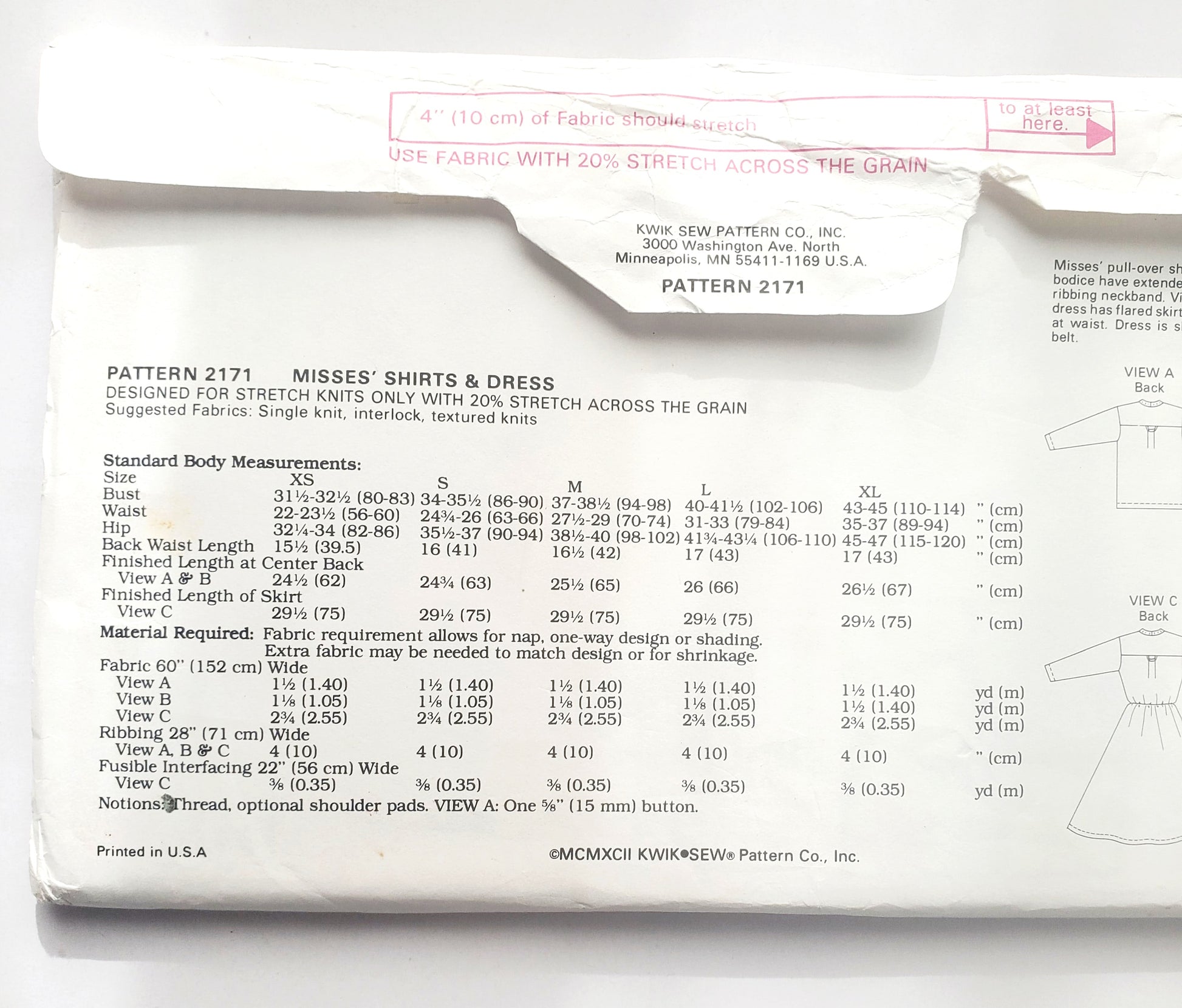 DESIGNED FOR STRETCH KNITS ONLY WITH 20% STRETCH ACROSS THE GRAIN Suggested Fabrics: Single knit, interlock, textured knits