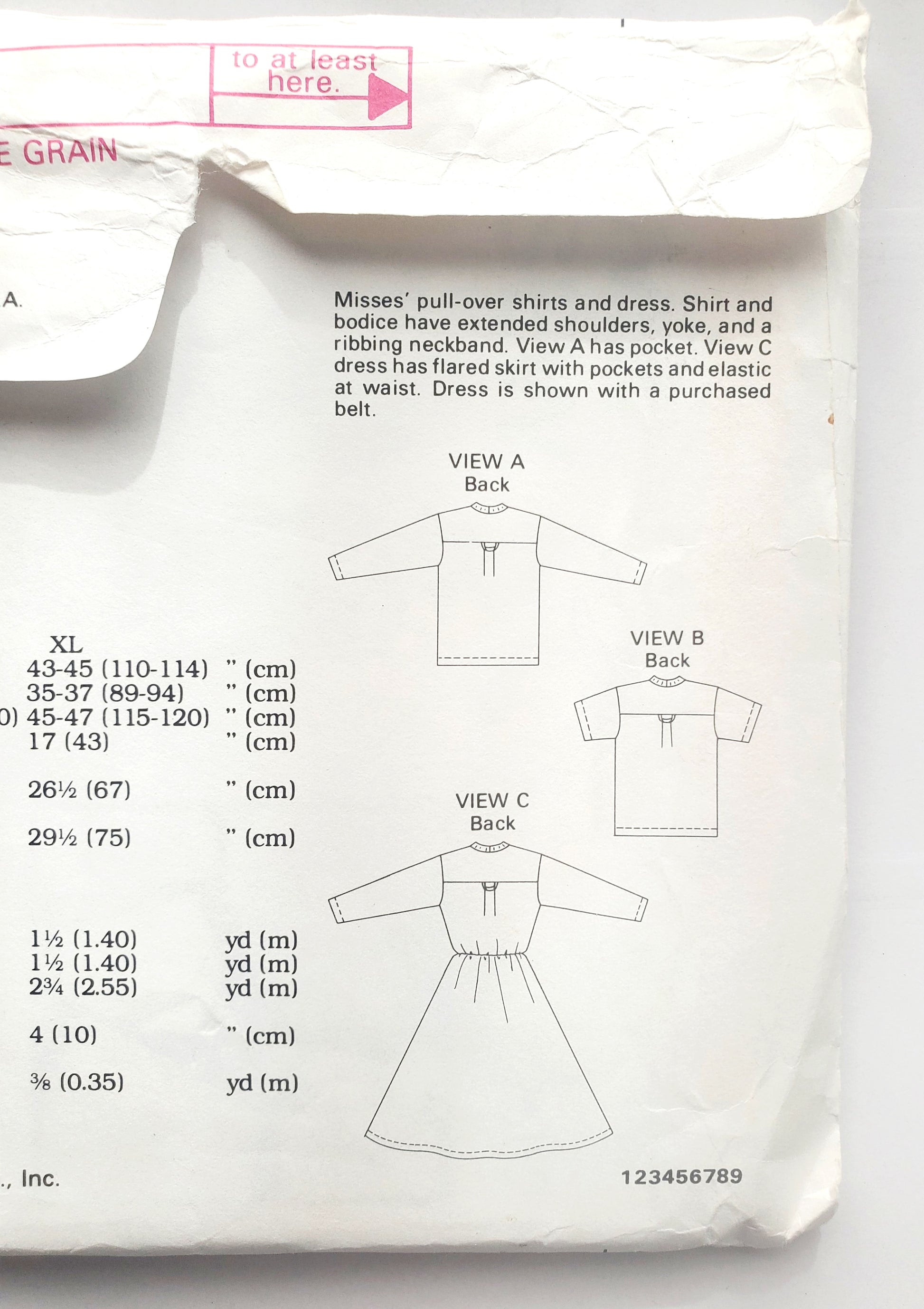 Misses' pull-over shirts and dress. Shirt and bodice have extended shoulders, yoke, and a ribbing neckband. View A has pocket. View C dress has flared skirt with pockets and elastic at waist. Dress is shown with a purchased belt.