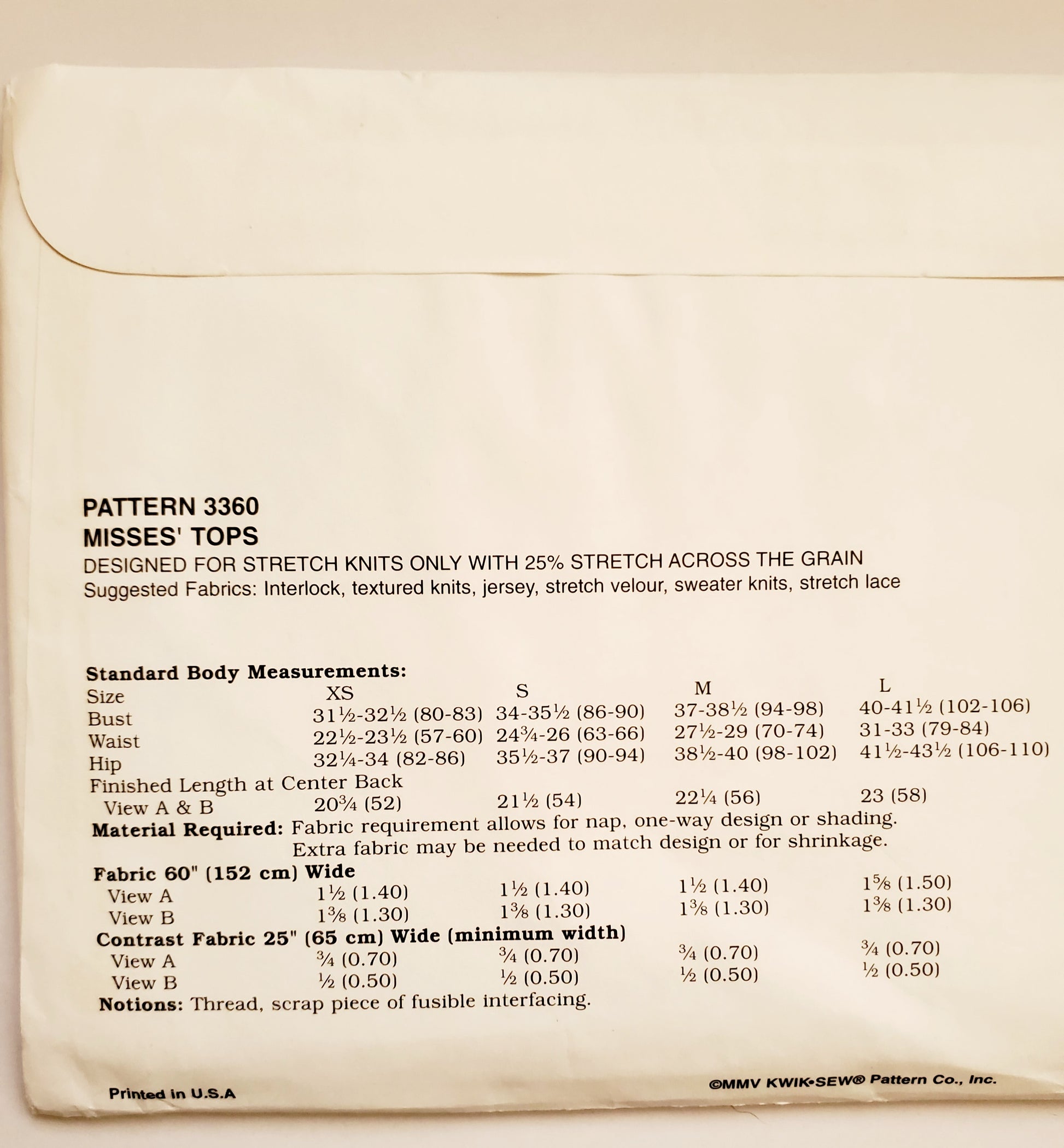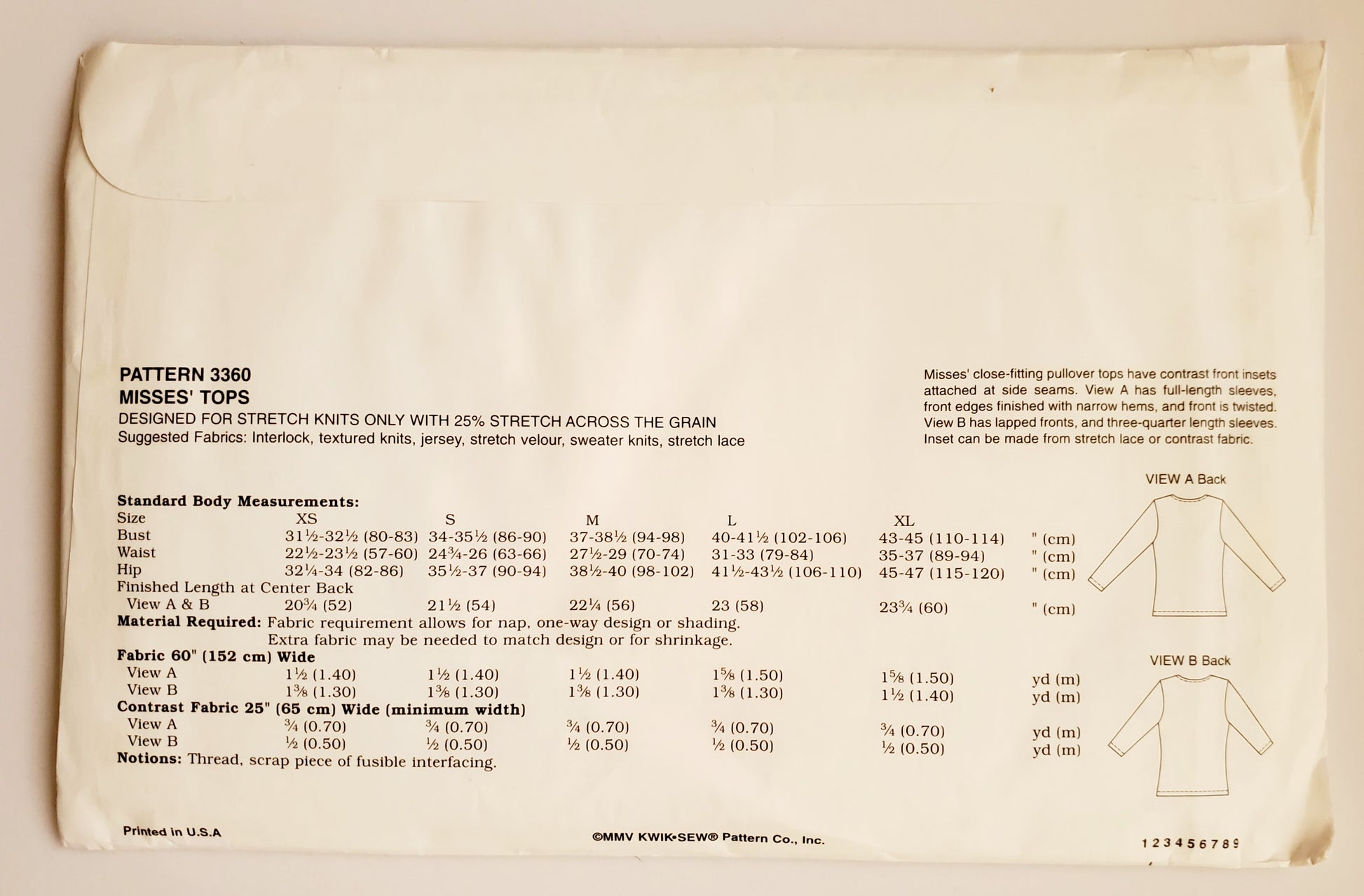 KWIK SEW Sewing Pattern 3360, Tops, Close-Fitting, Twisted Front, Lapped Front, Stretch Lace, Contrast Fabric, Size XS-XL