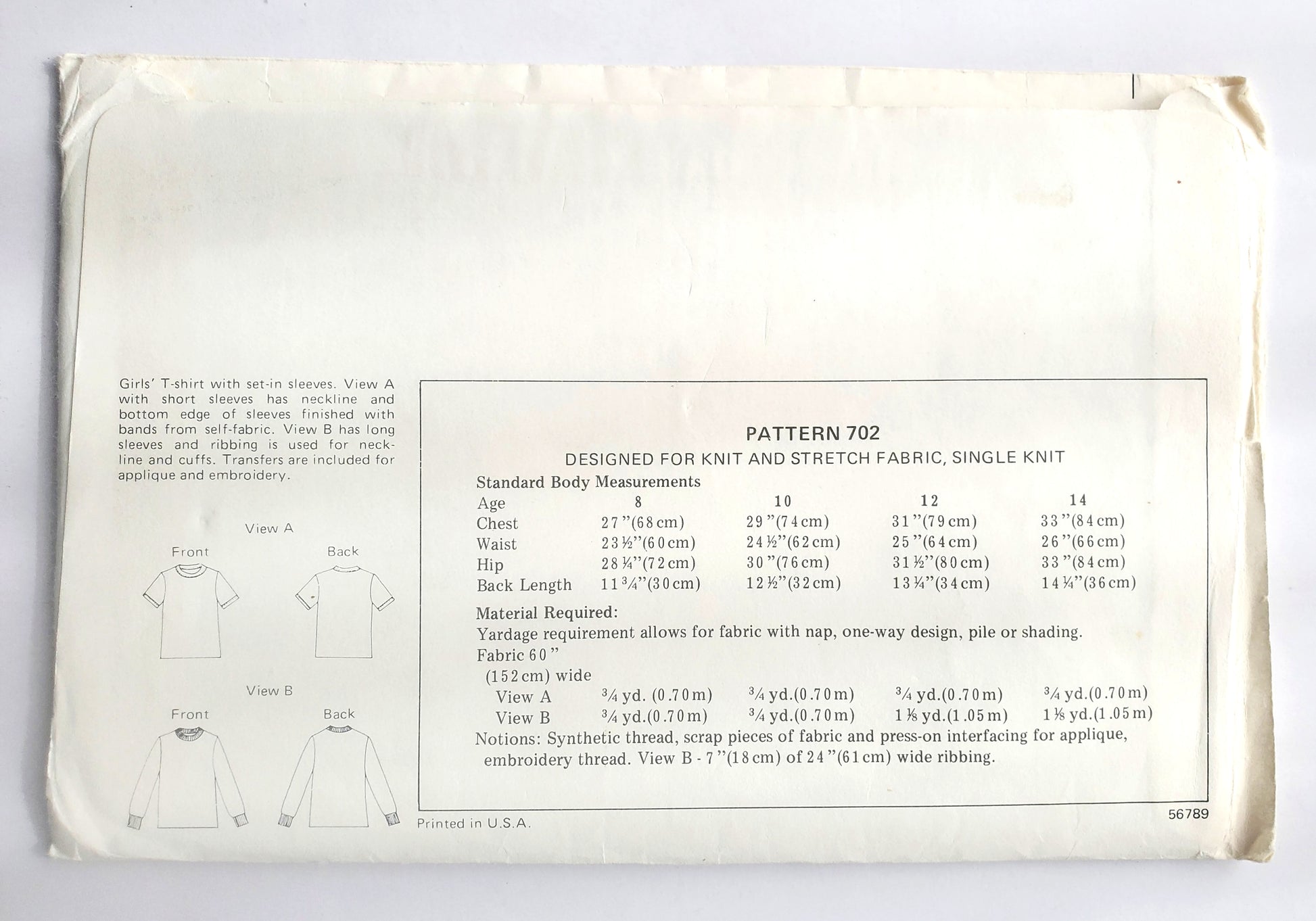 Girls' T-shirt with set-in sleeves. View A with short sleeves has neckline and bottom edge of sleeves finished with bands from self-fabric. View B has long sleeves and ribbing is used for neckline and cuffs. Transfers are included for applique and embroidery.
