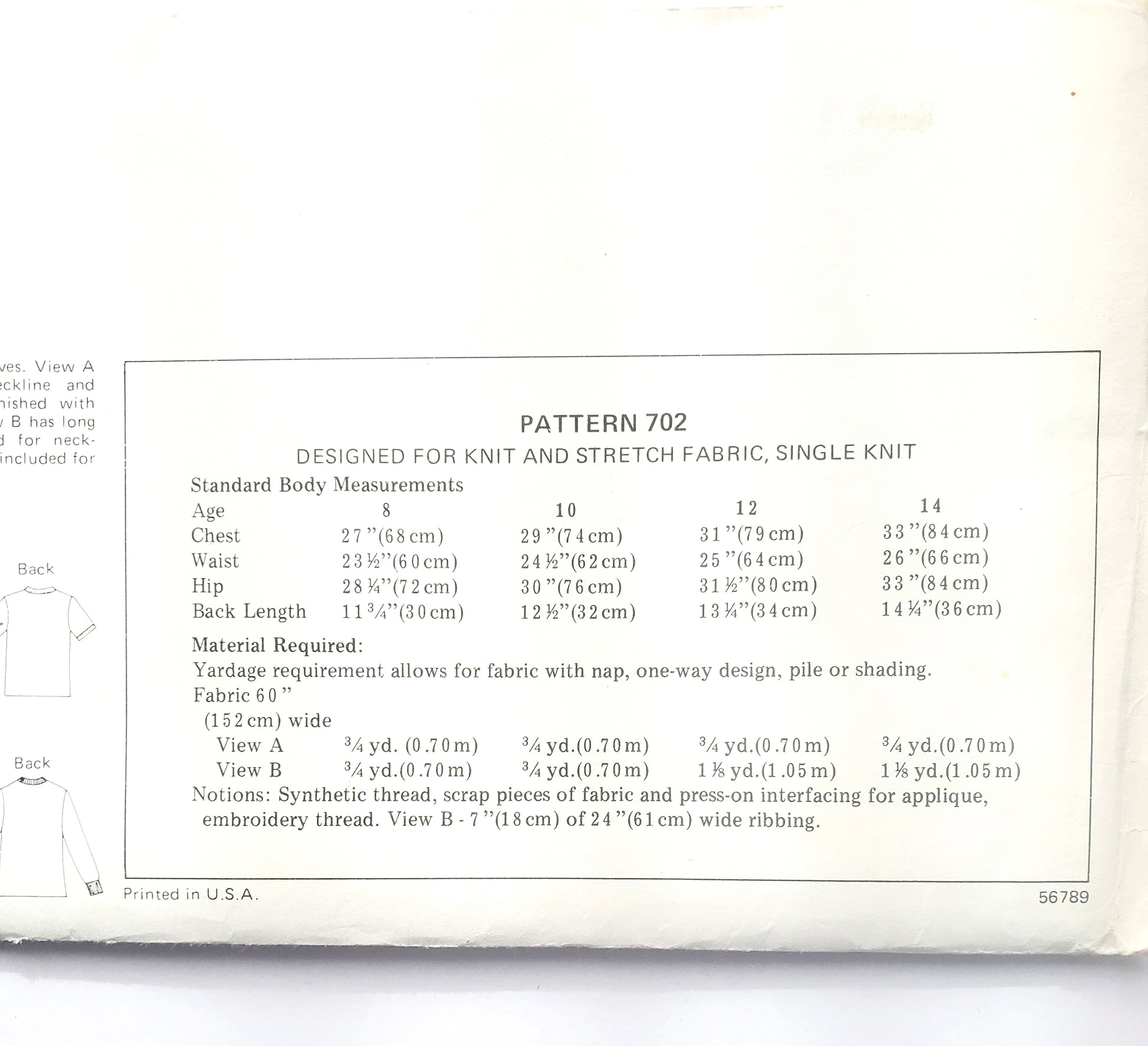 Notions: Synthetic thread, scrap pieces of fabric and press-on interfacing for applique, embroidery thread. View B - 7"(18 cm) of 24"(61 cm) wide ribbing.