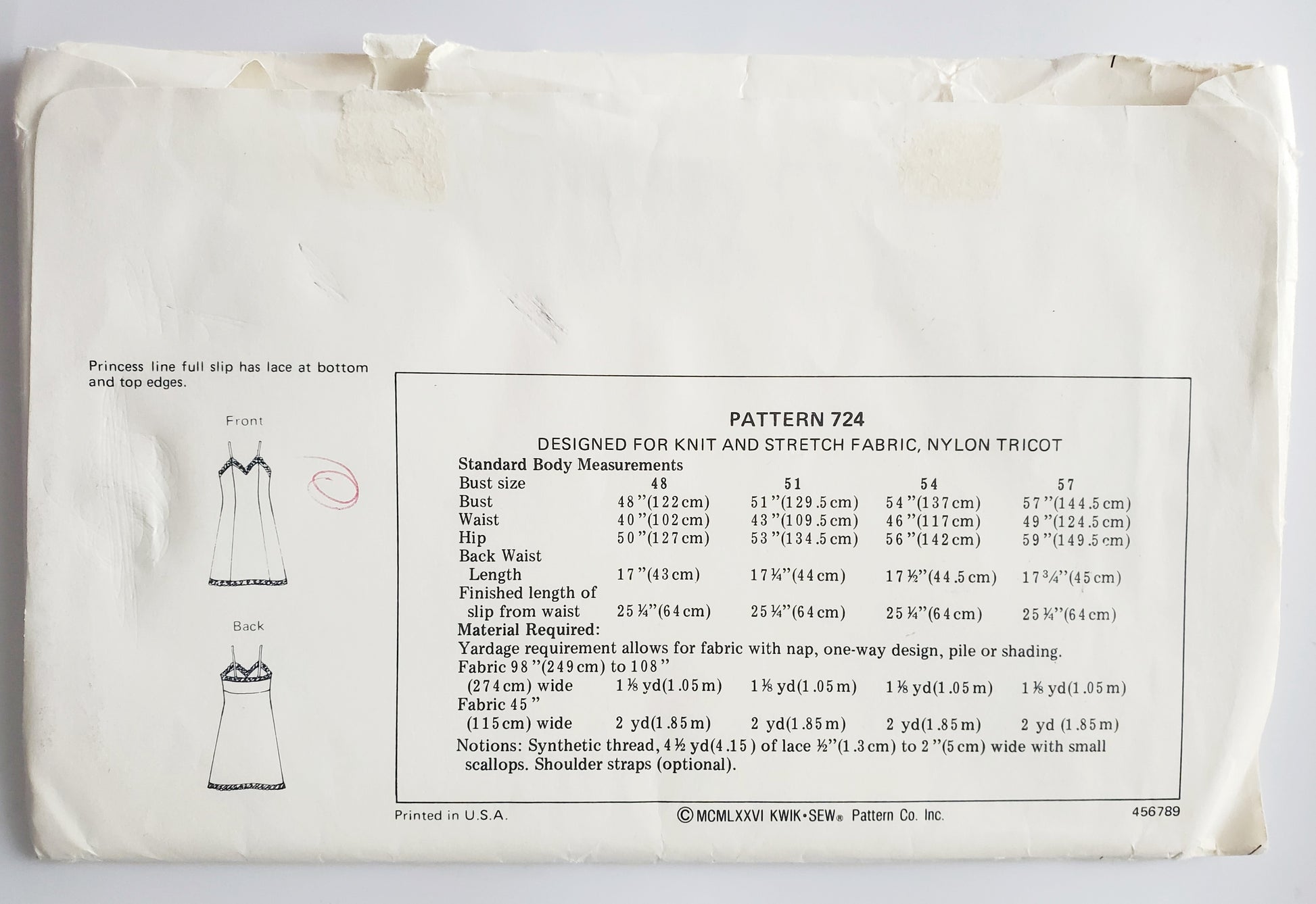 KWIK SEW Sewing Pattern 724, Full Slip, Lace, Princess Seams, Bust Sizes 48, 51, 54, 57