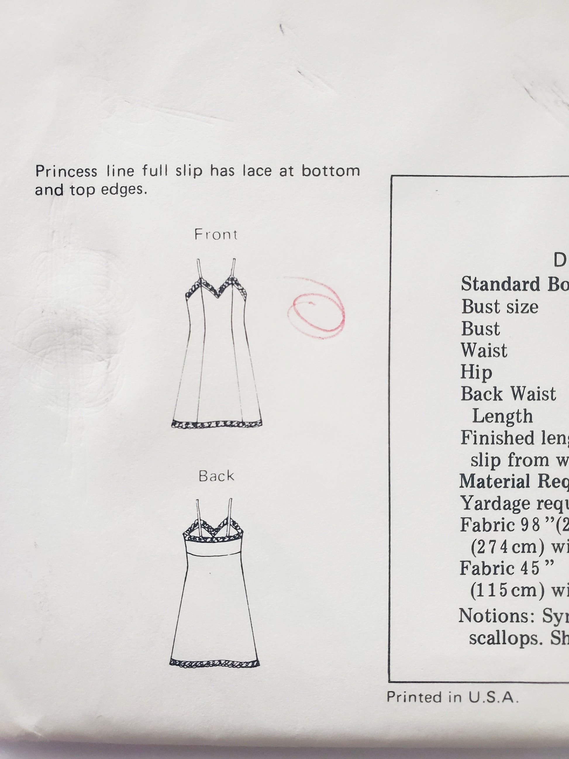 Notions: Synthetic thread, 4 ½ yd (4.15) of lace ½" (1.3 cm) to 2" (5 cm) wide with small scallops. Shoulder straps (optional).