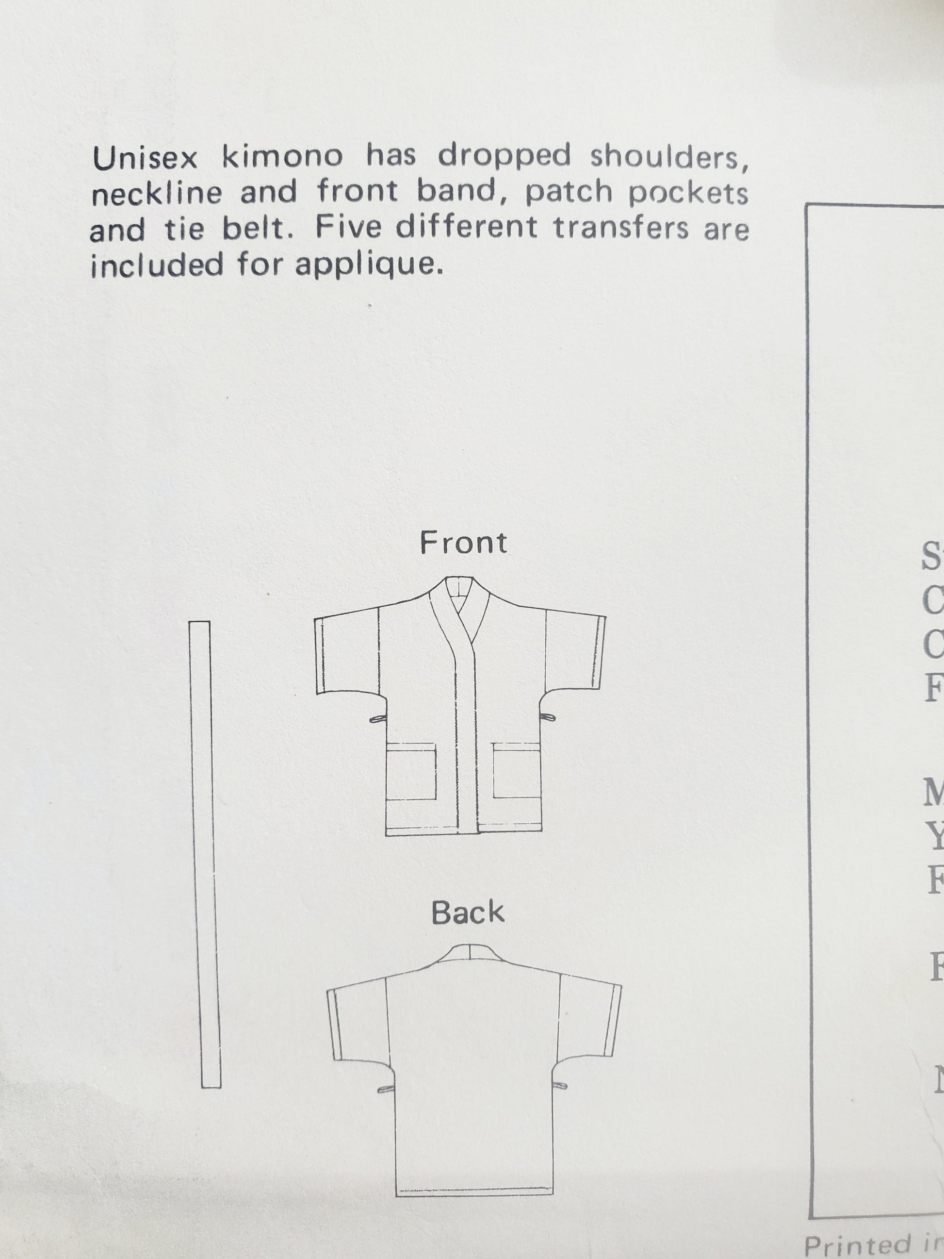 Unisex kimono has dropped shoulders, neckline and front band, patch pockets and tie belt. Five different transfers are included for applique.
