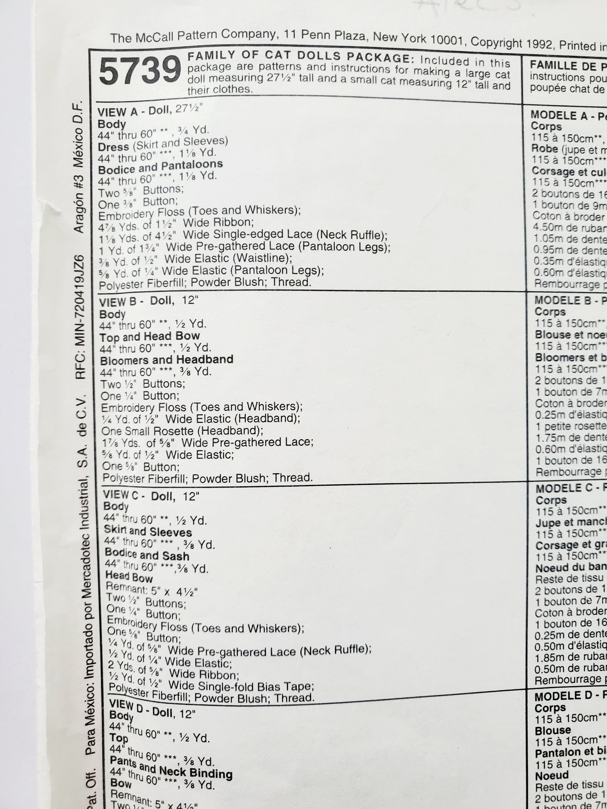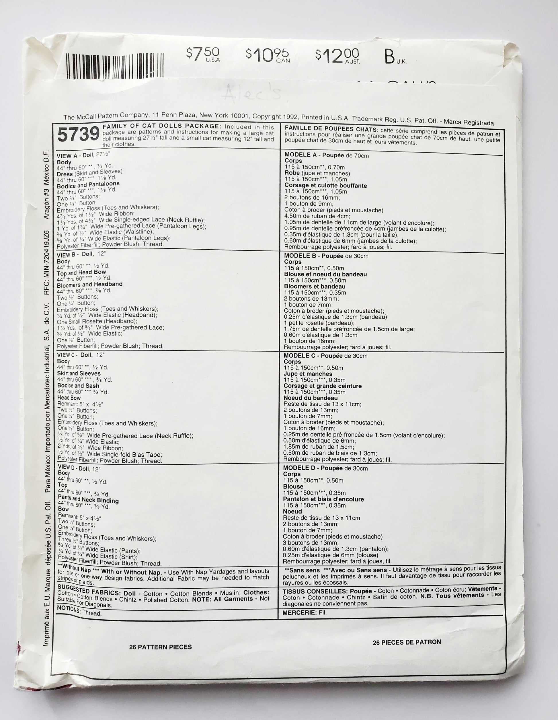 MCCALLS Craft Sewing Pattern Cat & Kittens 5739 Size 69cm (Mum Cat) 30cm (Kittens). Complete with Clothes.