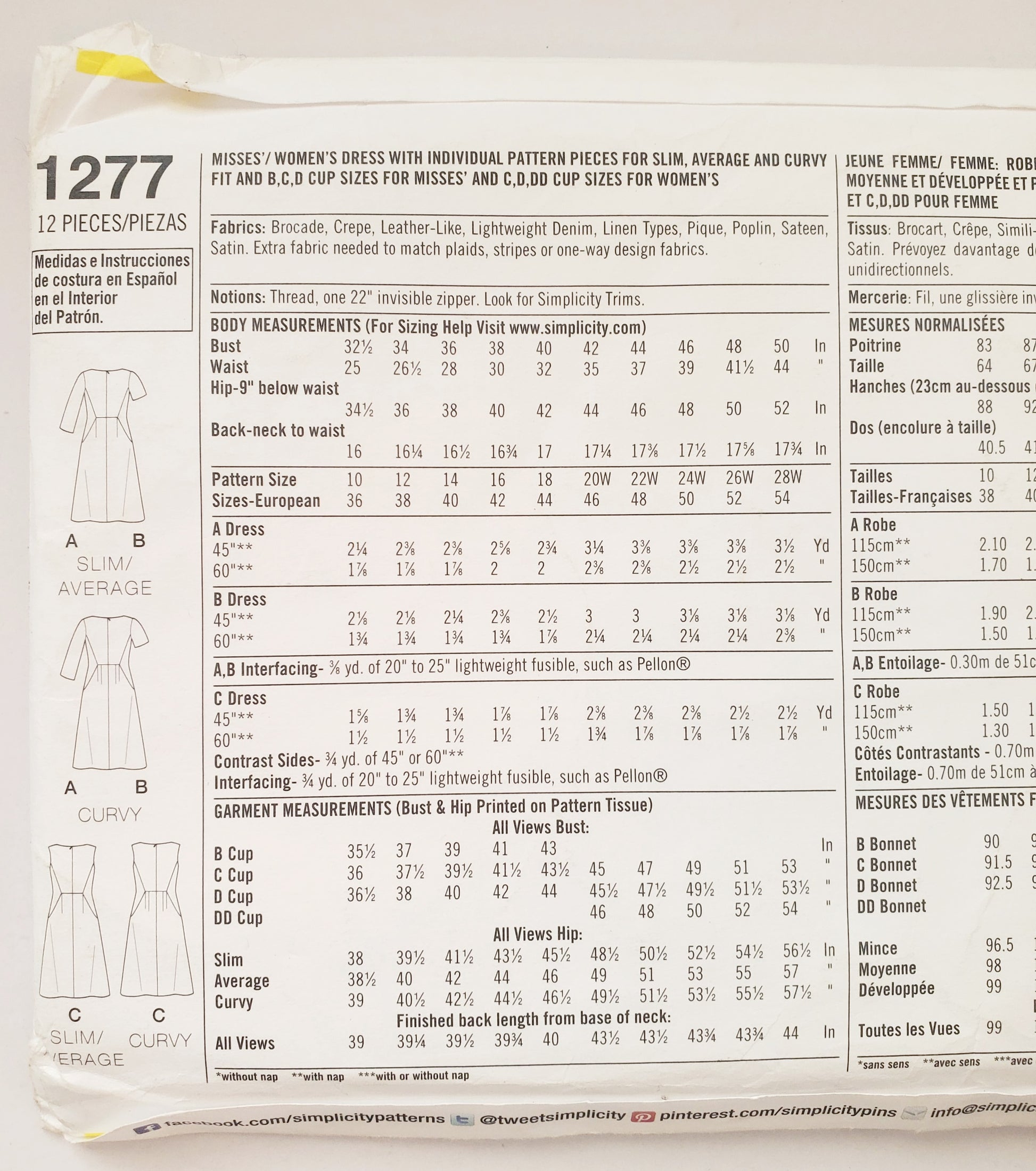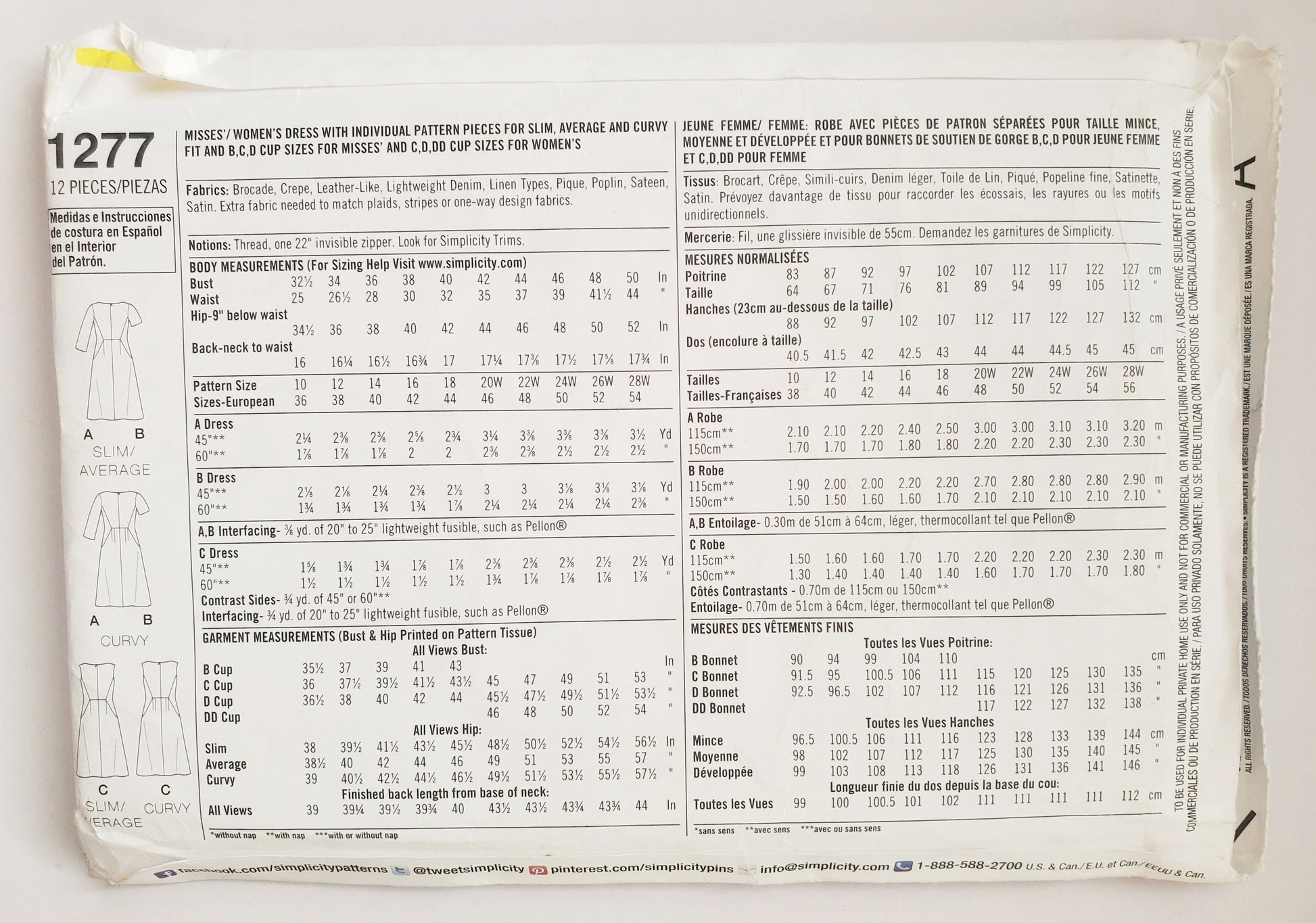 Simplicity Sewing Pattern 1277 Dress with practical hidden pockets and side insets. 1277 is part of the Amazing Fit collection, designed to help you achieve a flattering silhouette with personalized bust, waist, and hip adjustments. This pattern includes options for Miss and Plus sizes.