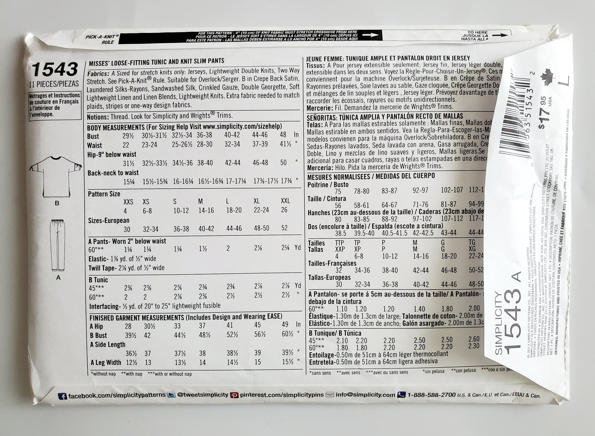 SIMPLICITY Sewing Pattern 1543, Long Top, Long Tunic, Knit Pants, Pants, Close Fitting, Size 4-26