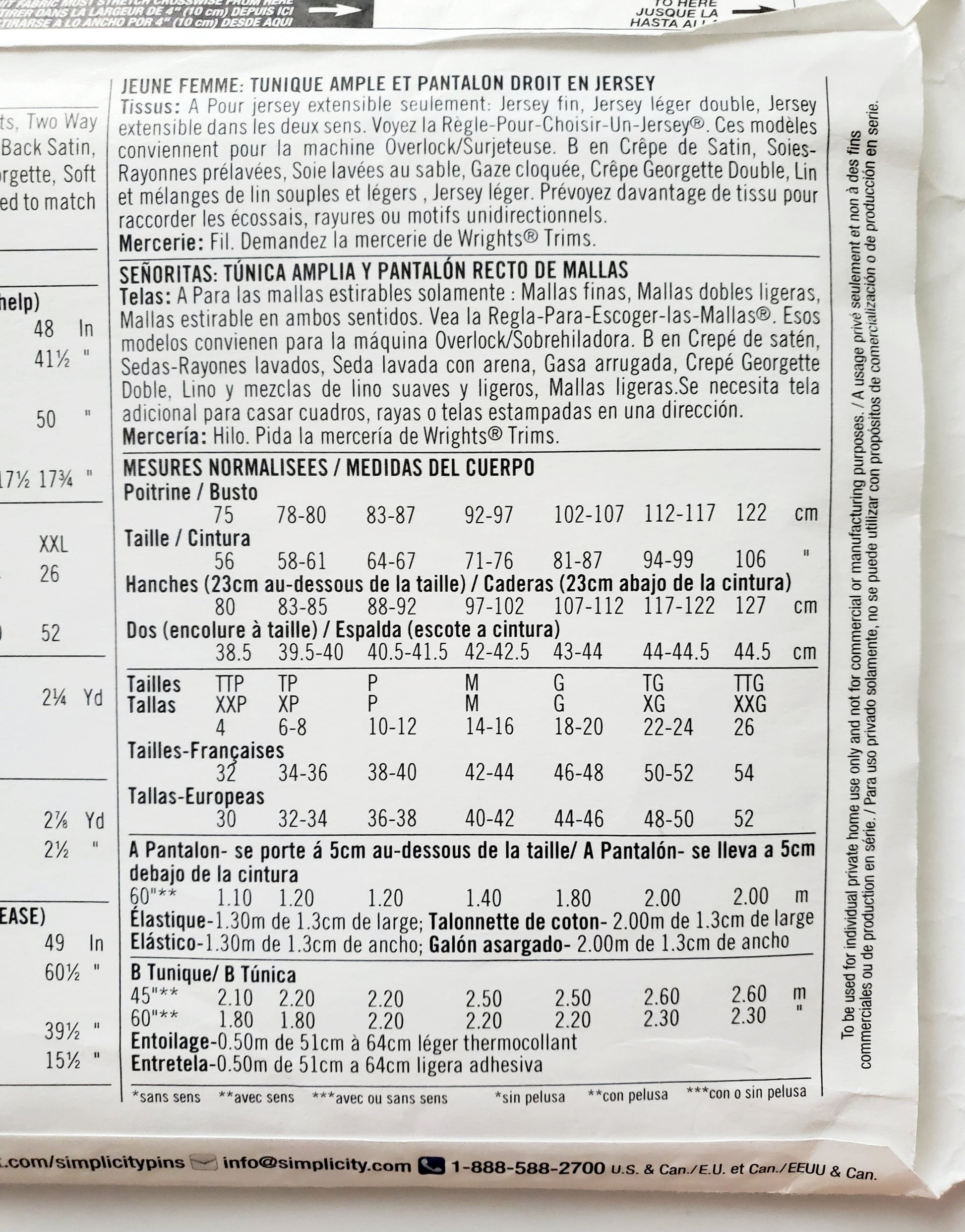 Fabrics: A Sized for stretch knits only: Jerseys, Lightweight Double Knits, Two Way Stretch. See Pick-A-Knit Rule. Suitable for Overlock/Serger. B in Crepe Back Satin, Laundered Silks-Rayons, Sandwashed Silk, Crinkled Gauze, Double Georgette, Soft Lightweight Linen and Linen Blends, Lightweight Knits. Extra fabric needed to match plaids, stripes or one-way design fabrics.
