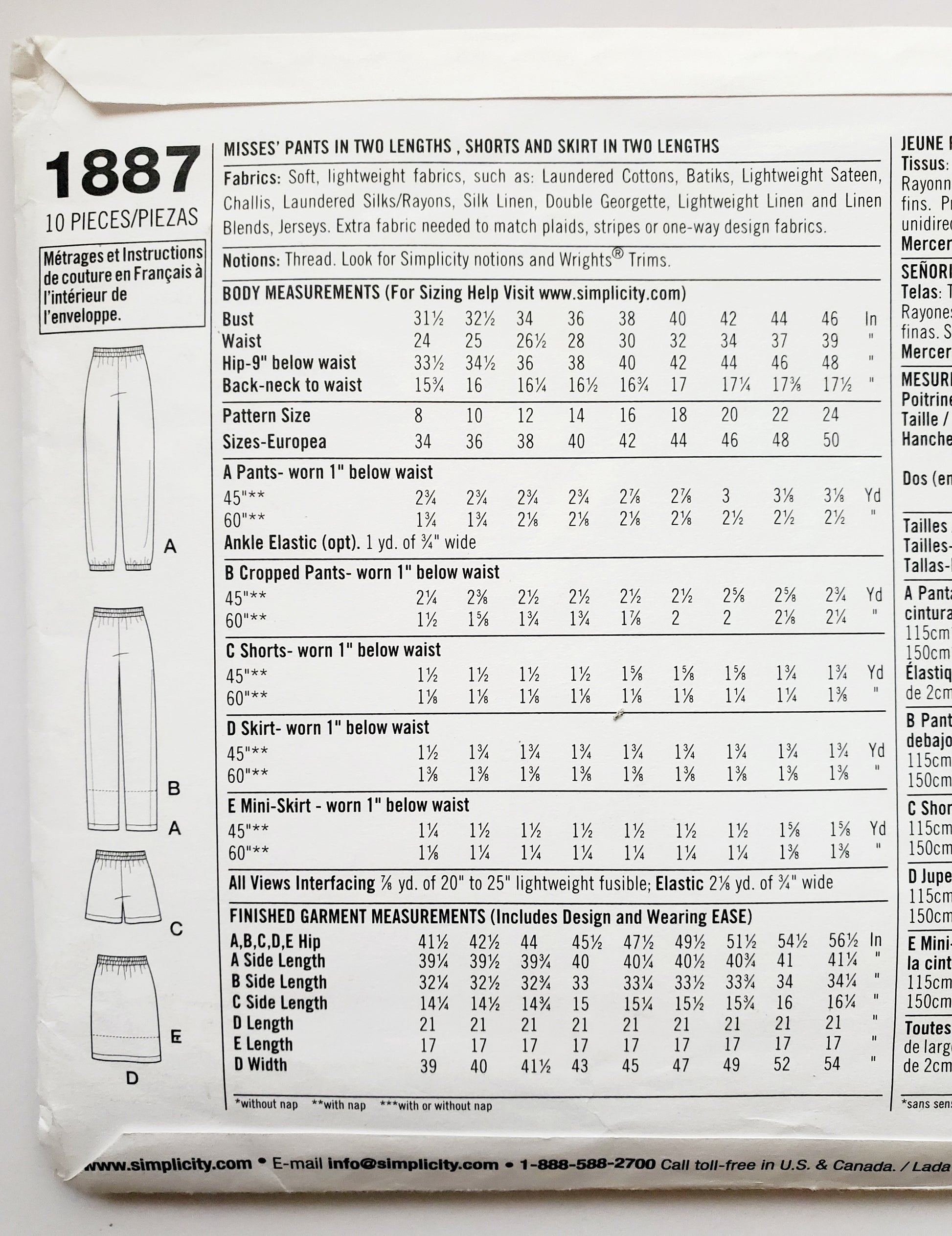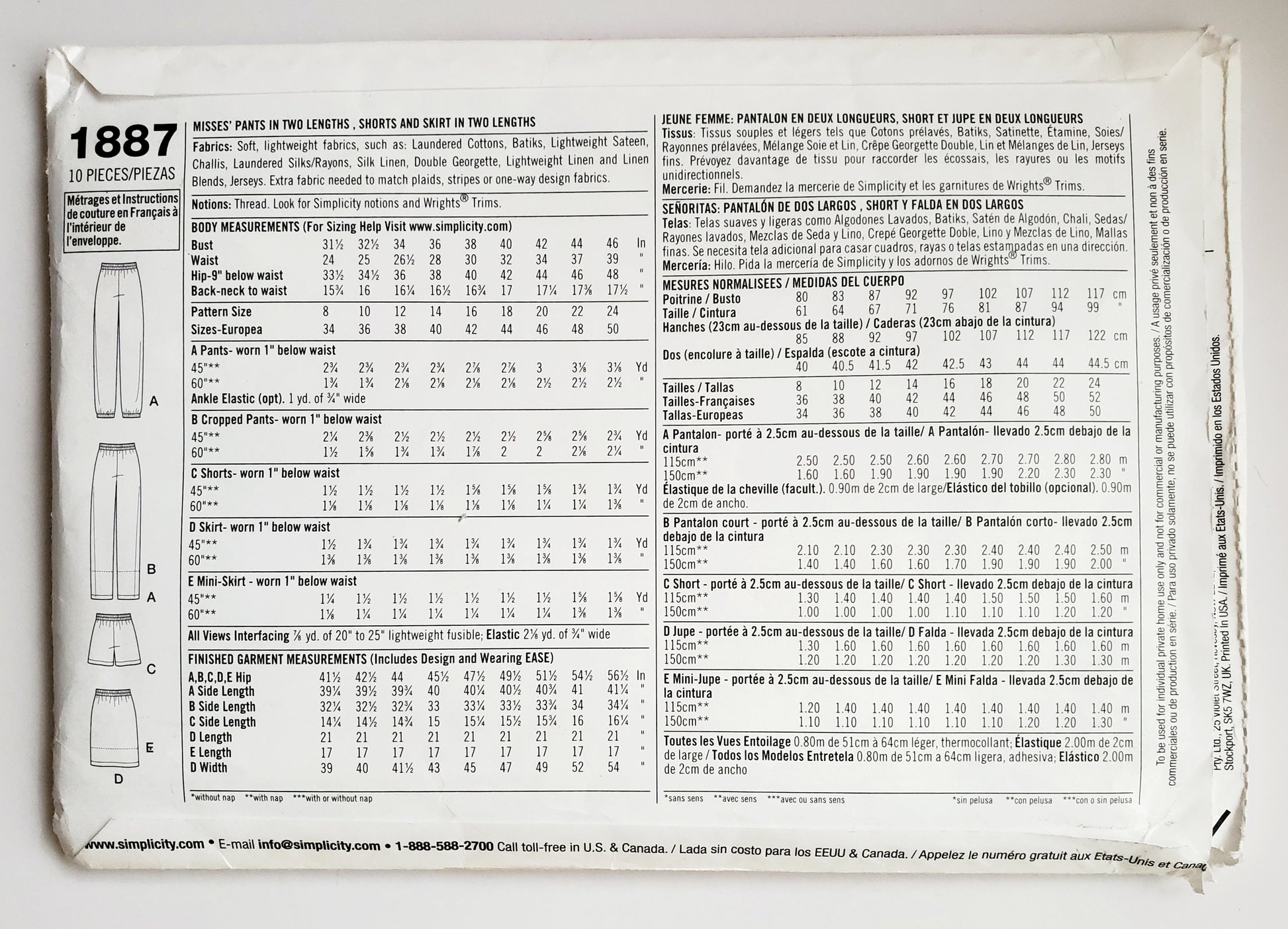 SIMPLICITY Sewing Pattern 1887 Pants, Cropped Pants, Shorts, Skirt, Mini Skirt SIZE 16-24