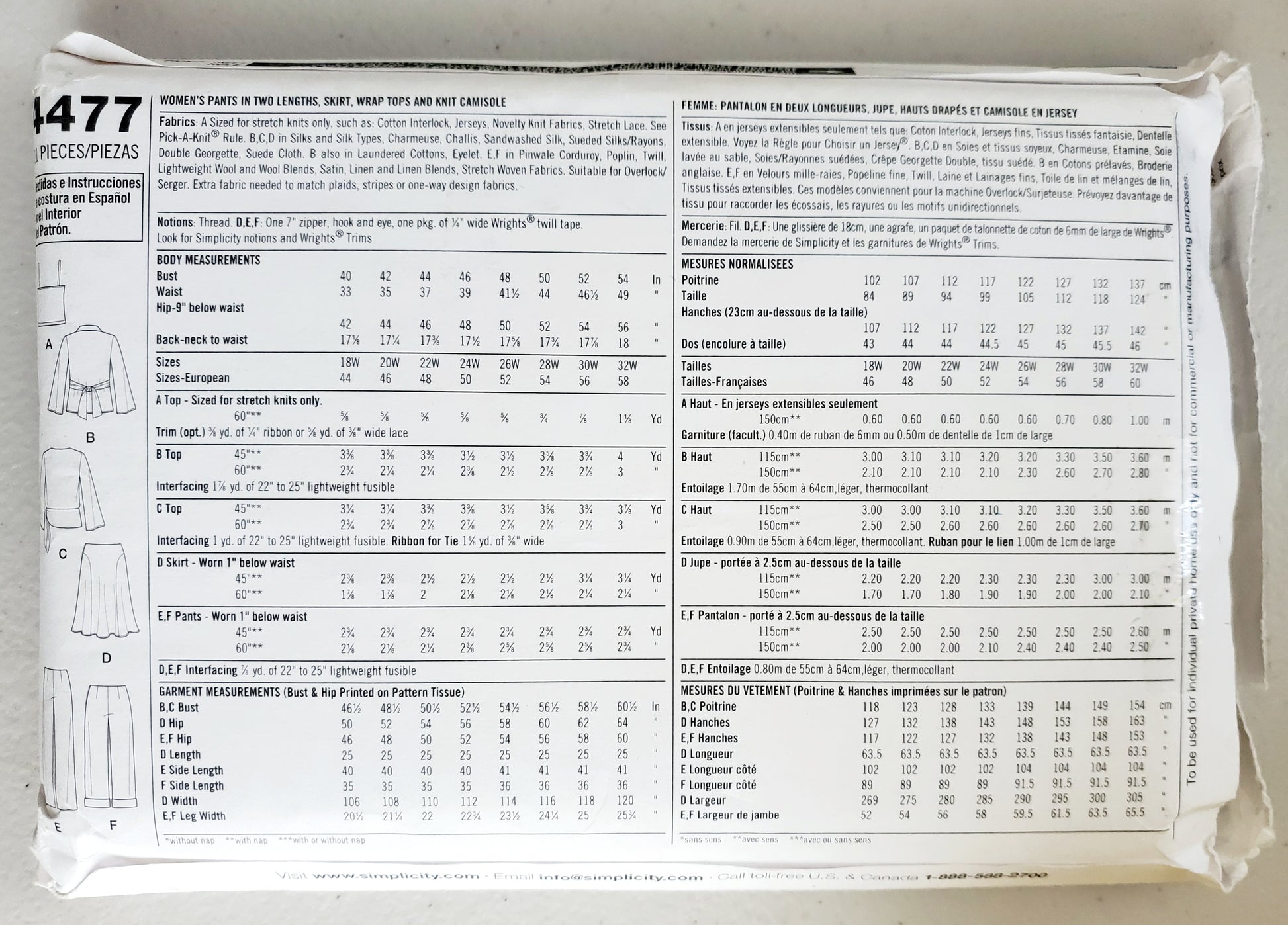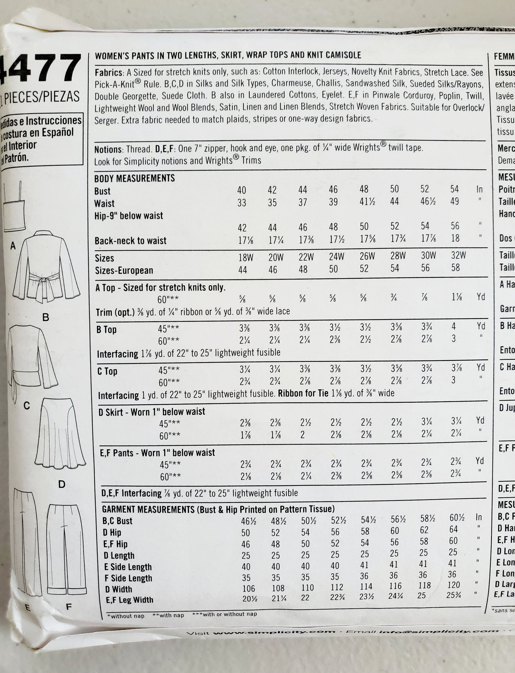 SIMPLICITY Sewing Pattern 4477, Pants Skirt, Wrap Tops, Knit Camisole Plus Size 18-24