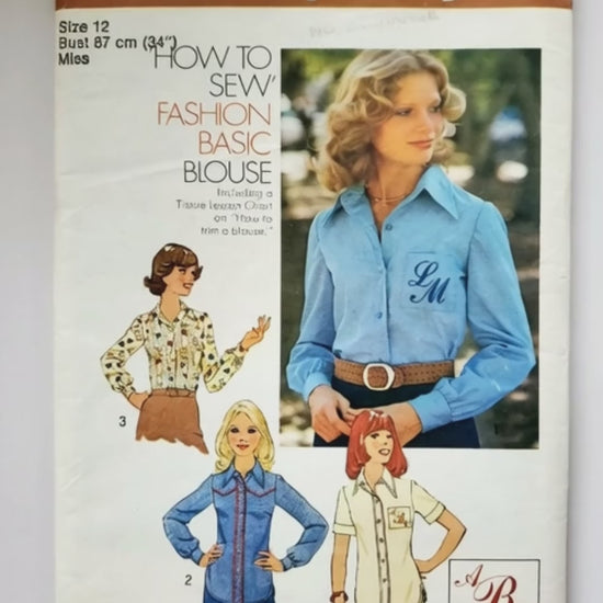 The blouse with front button or snap closing has shirt type collar, set-in sleeves and top-stitched lower edge. V. 1, 2 and 3 have long sleeves gathered to button or snap fastened cuffs. V. 1 and 4 with top-stitching trim forming simulated front band features patch pocket with embroidered monogram. Top-stitched V. 2 features rick-rack trim forming simulated yoke and front band. V. 3 has lace trim. V. 4 has short sleeves with turn back cuffs.