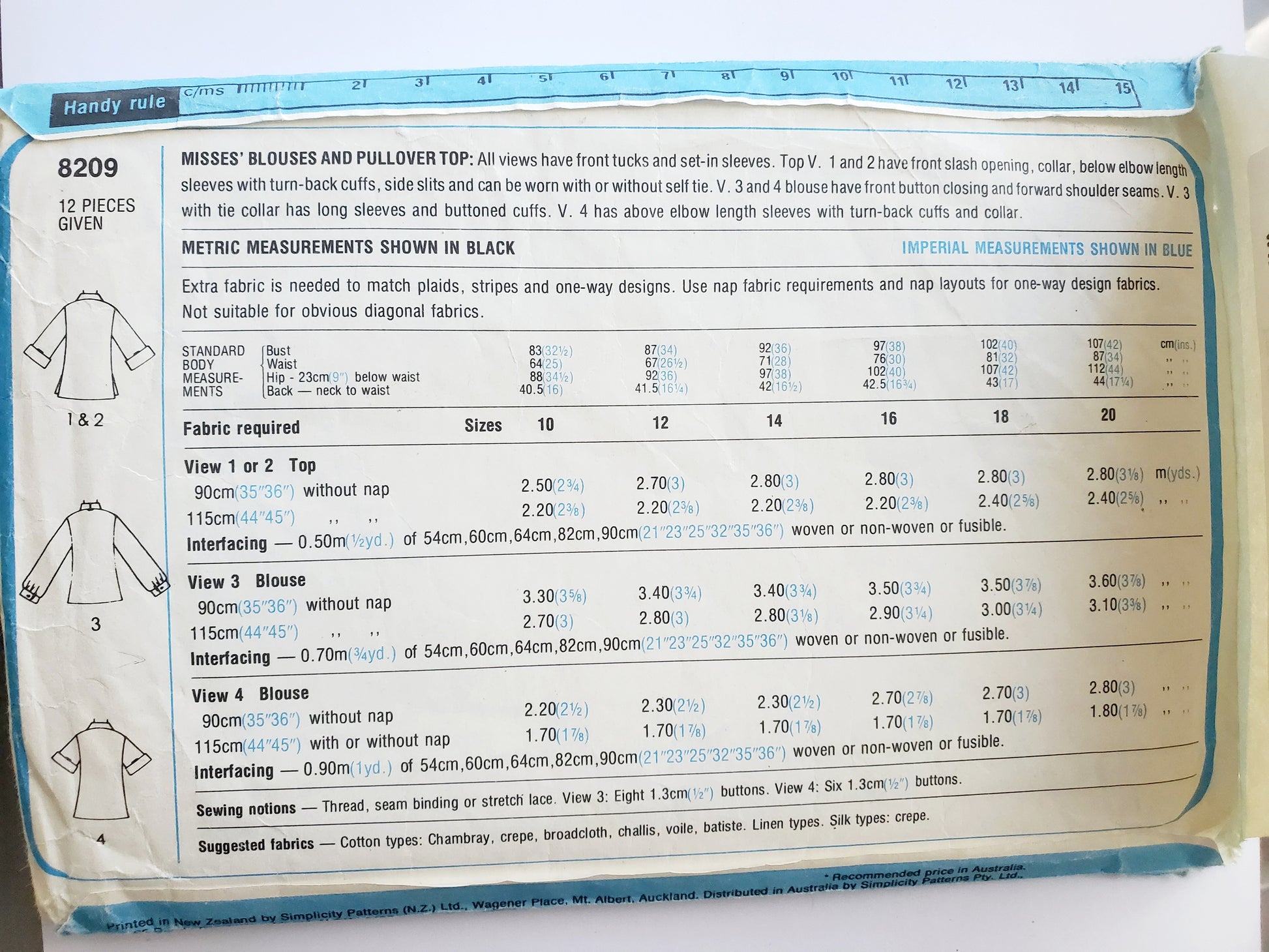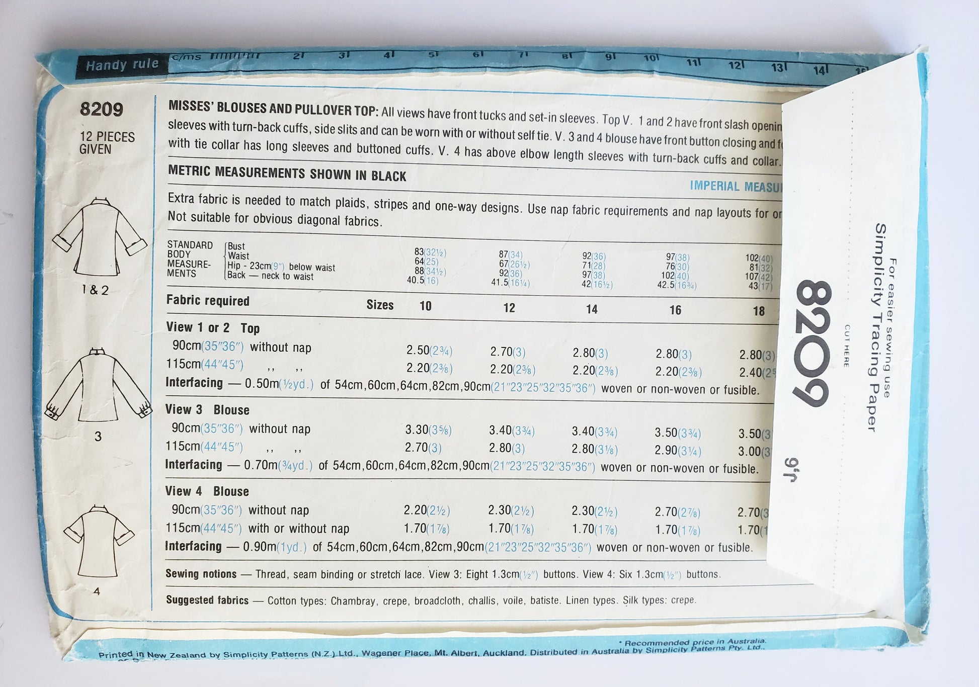 SIMPLICITY Sewing Pattern 8209, Vintage Blouse, Pullover Top, Front Slash Opening, Cuffs, Size 18, 20