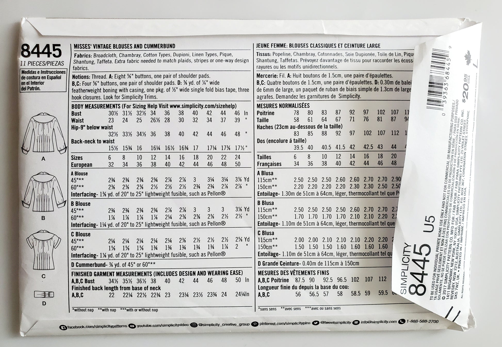 SIMPLICITY Sewing Pattern 8445, Vintage, 50's, Blouse, Cummerbund, Top, Size 16-24