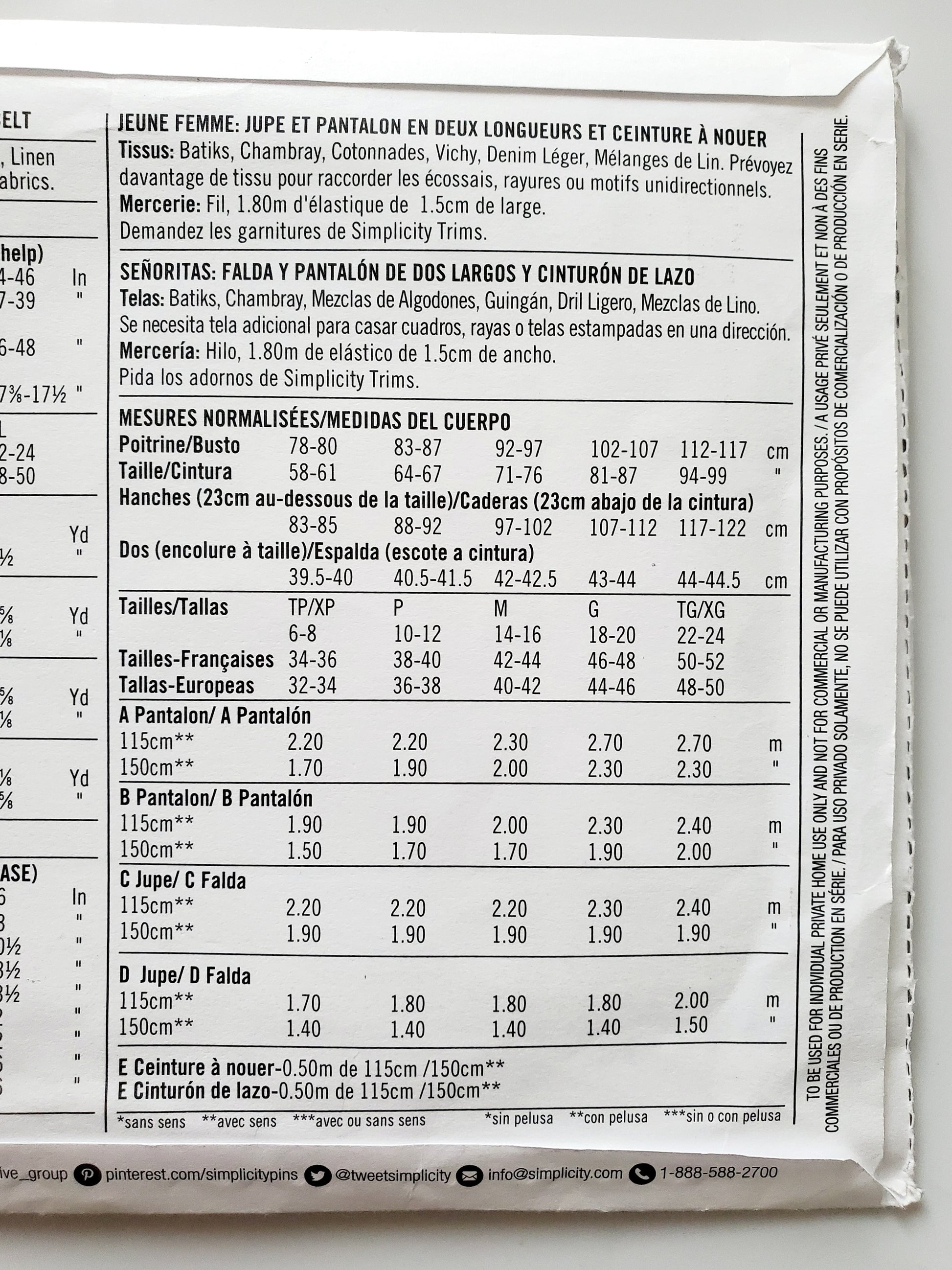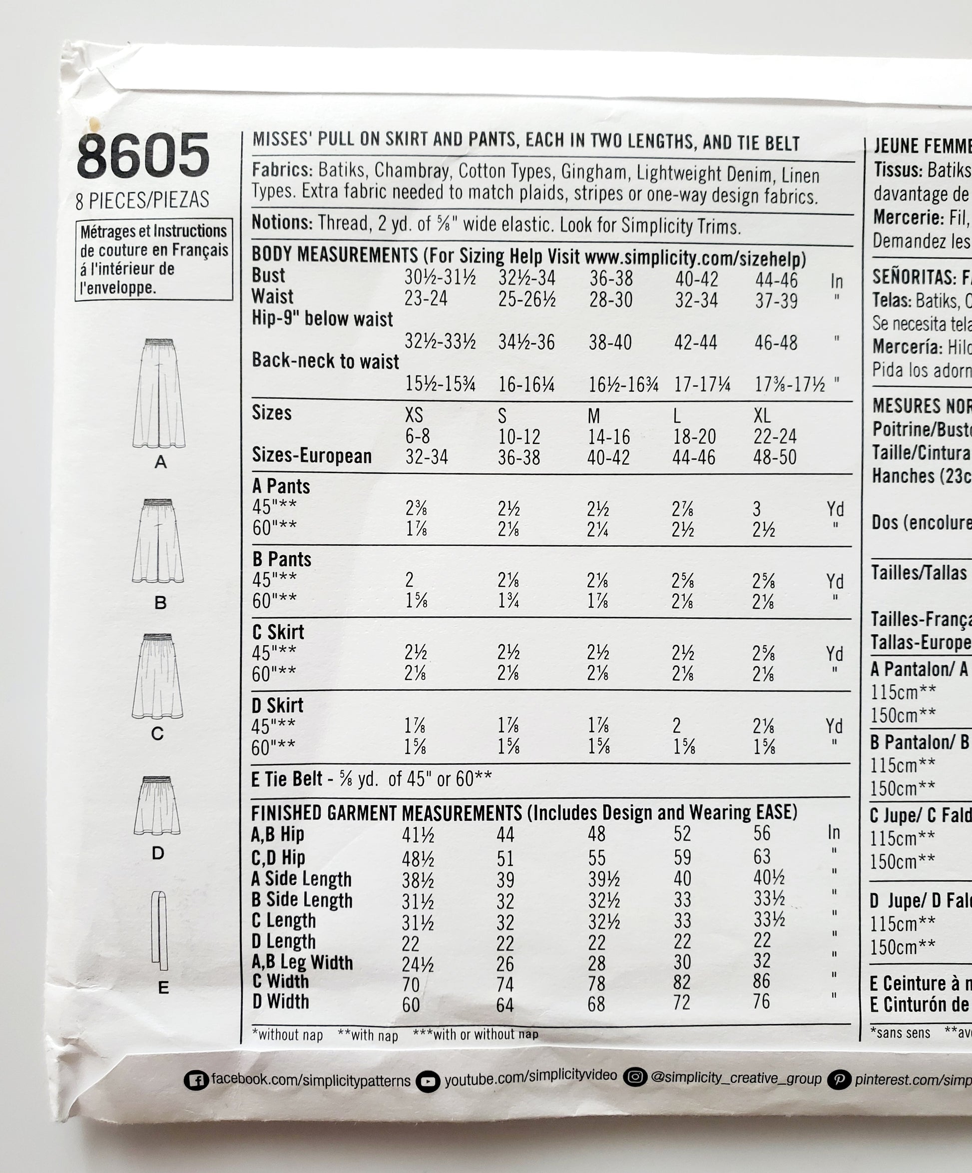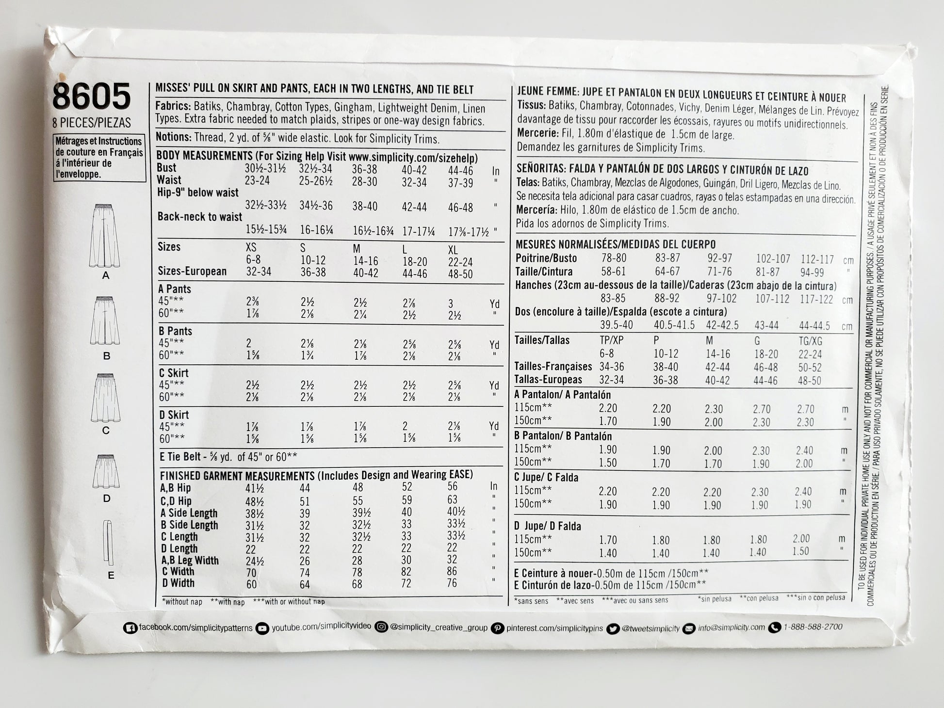 SIMPLICITY Sewing Pattern 8605, Skirt, Pull on Skirt, Pants, Pull on Pants, Tie Belt, Size 6-24
