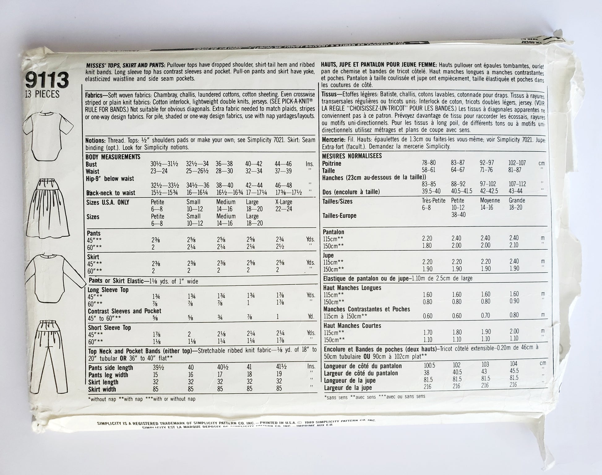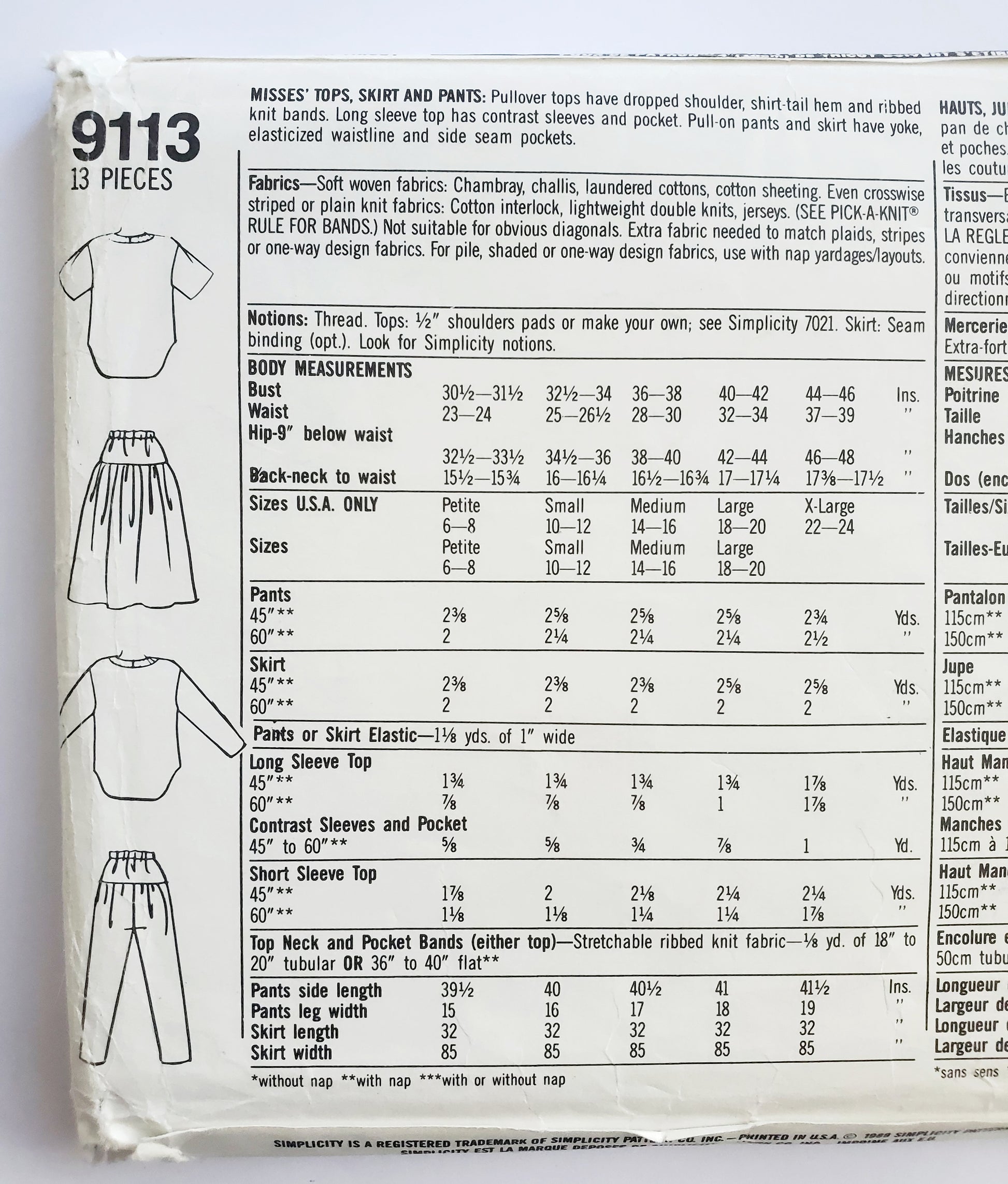 MISSES' TOPS, SKIRT AND PANTS: Pullover tops have dropped shoulder, shirt-tail hem and ribbed knit bands. Long sleeve top has contrast sleeves and pocket. Pull-on pants and skirt have yoke, elasticized waistline and side seam pockets.