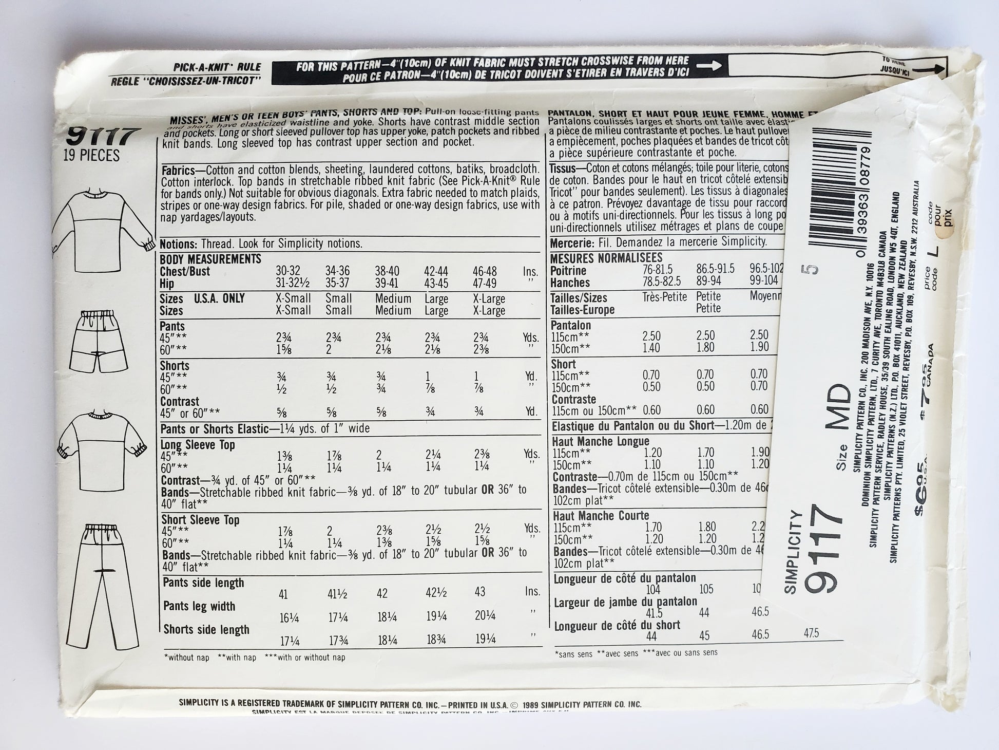 Fabrics—Cotton and cotton blends, sheeting, laundered cottons, batiks, broadcloth. Cotton interlock. Top bands in stretchable ribbed knit fabric (See Pick-A-Knit™ Rule for bands only.) Not suitable for obvious diagonals. Extra fabric needed to match plaids, stripes or one-way design fabrics. For pile, shaded or one-way design fabrics, use with nap yardages/layouts.