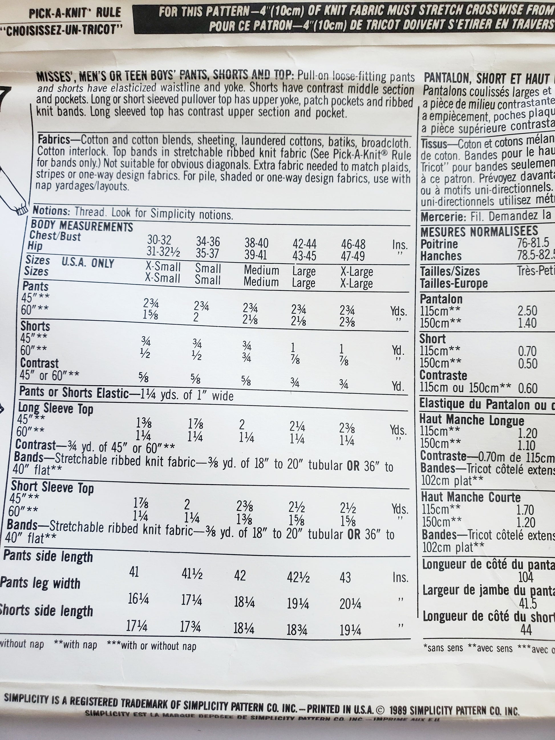 MISSES, MEN'S OR TEEN BOYS' PANTS, SHORTS AND TOP: Pull-on loose-fitting pants and shorts have elasticized waistline and yoke. Shorts have contrast middle section and pockets. Long or short sleeved pullover top has upper yoke, patch pockets and ribbed knit bands. Long sleeved top has contrast upper section and pocket.
