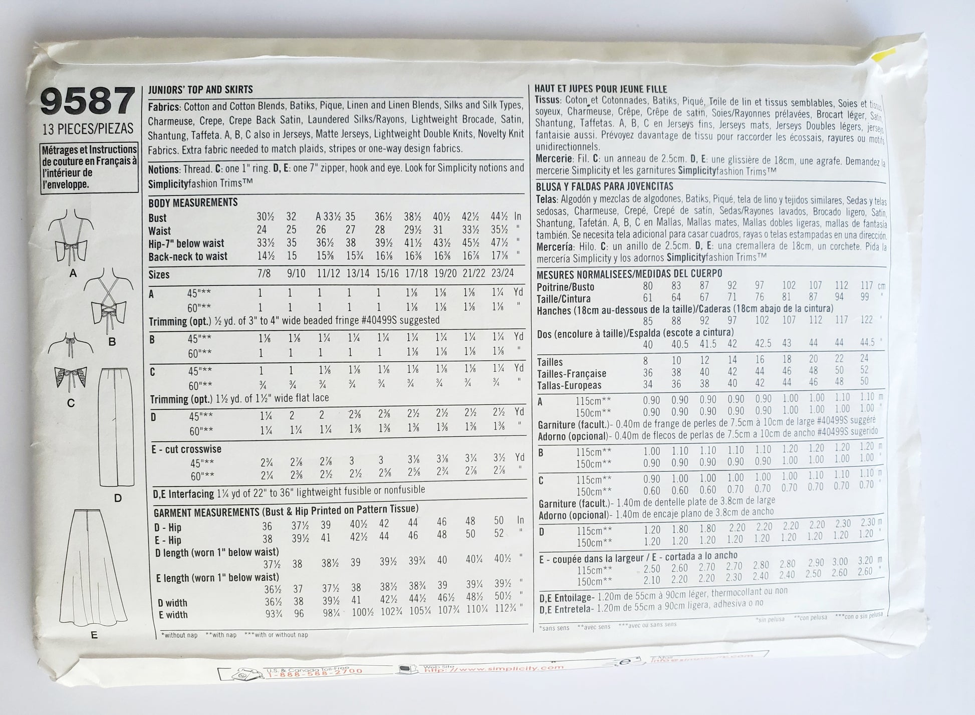 SIMPLICITY Sewing Pattern 9587, Top, Skirt, Prom Outfit, Junior, Teen, Girls, Size 7/8 - 15/16
