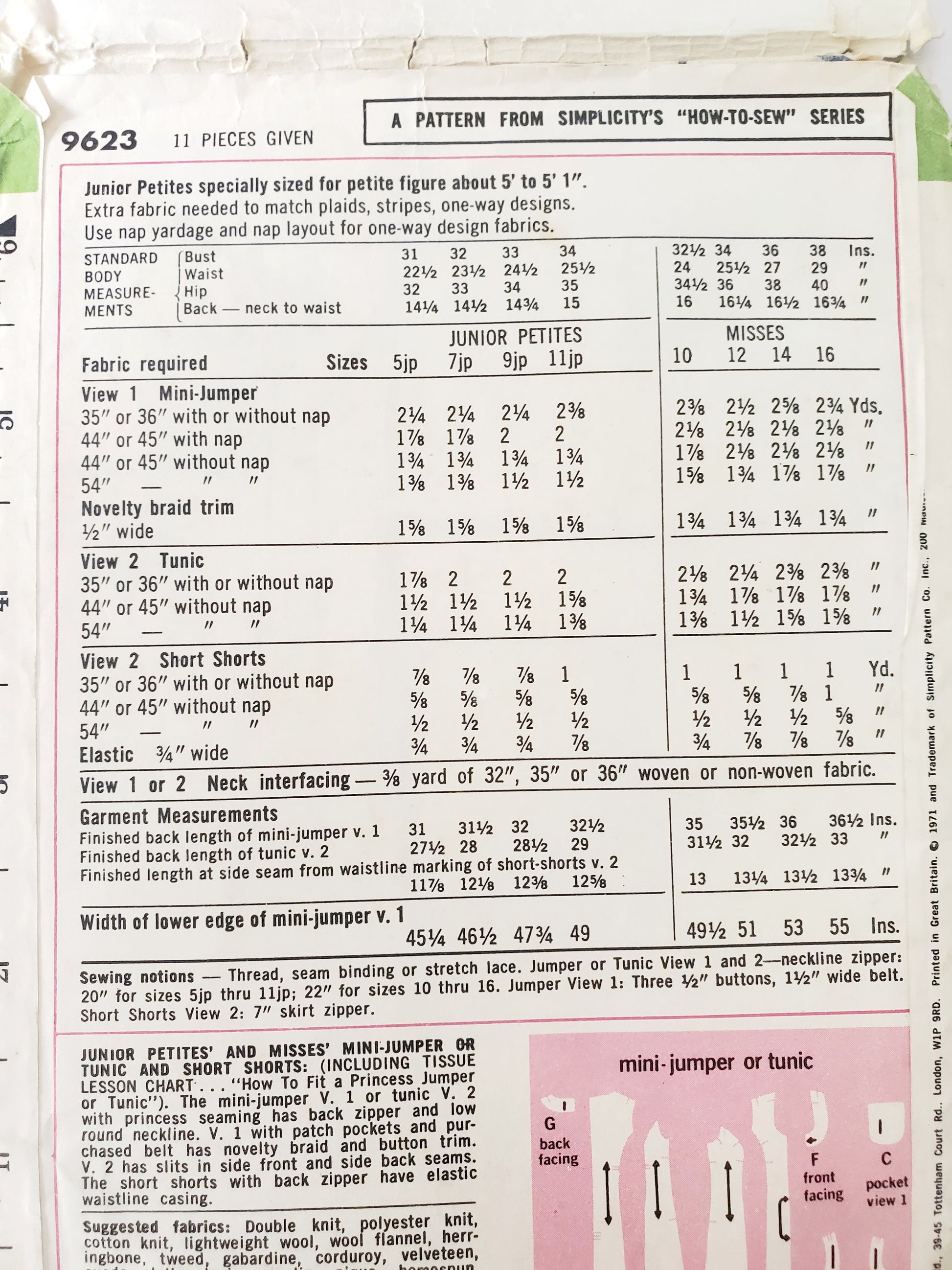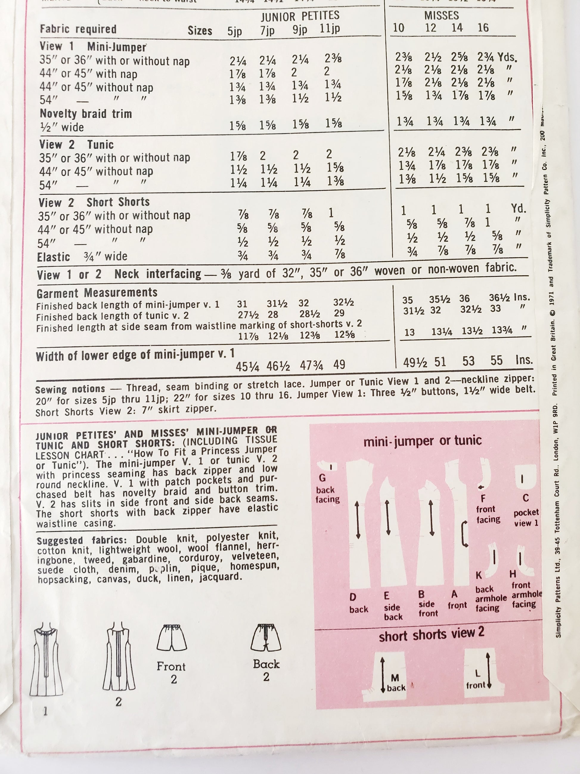 JUNIOR PETITES' AND MISSES' MINI-JUMPER OR TUNIC AND SHORT SHORTS: (INCLUDING TISSUE LESSON CHART... "How To Fit a Princess Jumper or Tunic"). The mini-jumper V. 1 or tunic V. 2 with princess seaming has back zipper and low round neckline. V. 1 with patch pockets and purchased belt has novelty braid and button trim. V. 2 has slits in side front and side back seams. The short shorts with back zipper have elastic waistline casing.