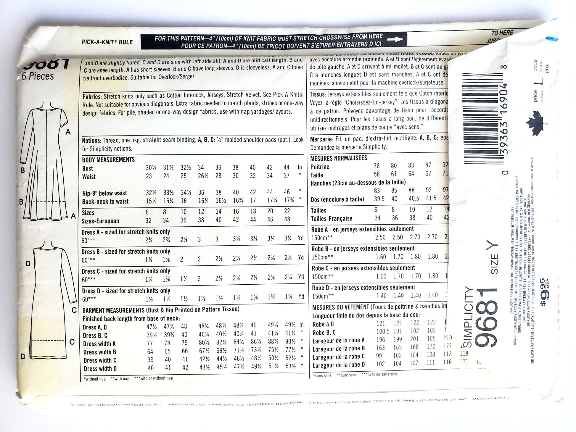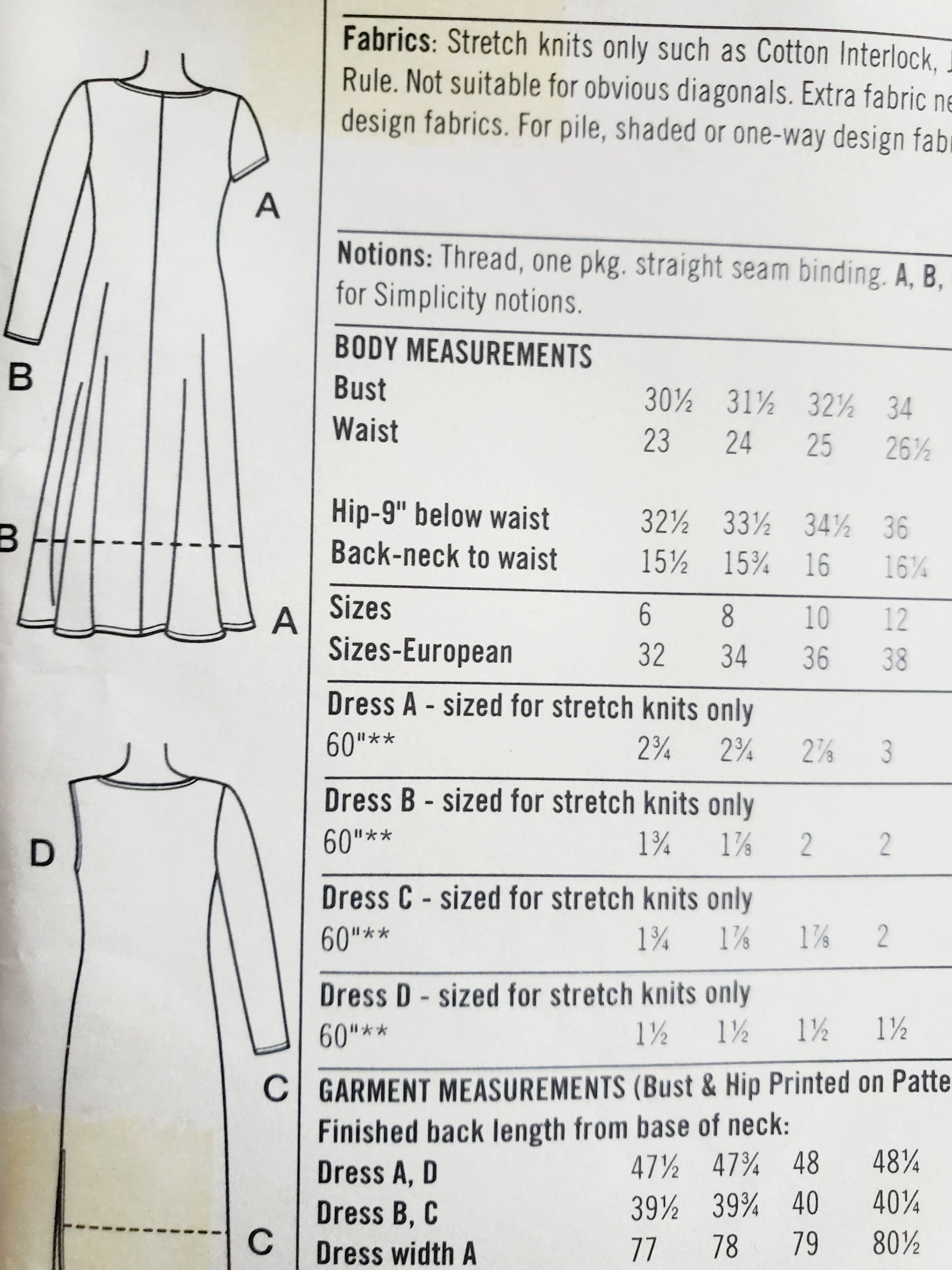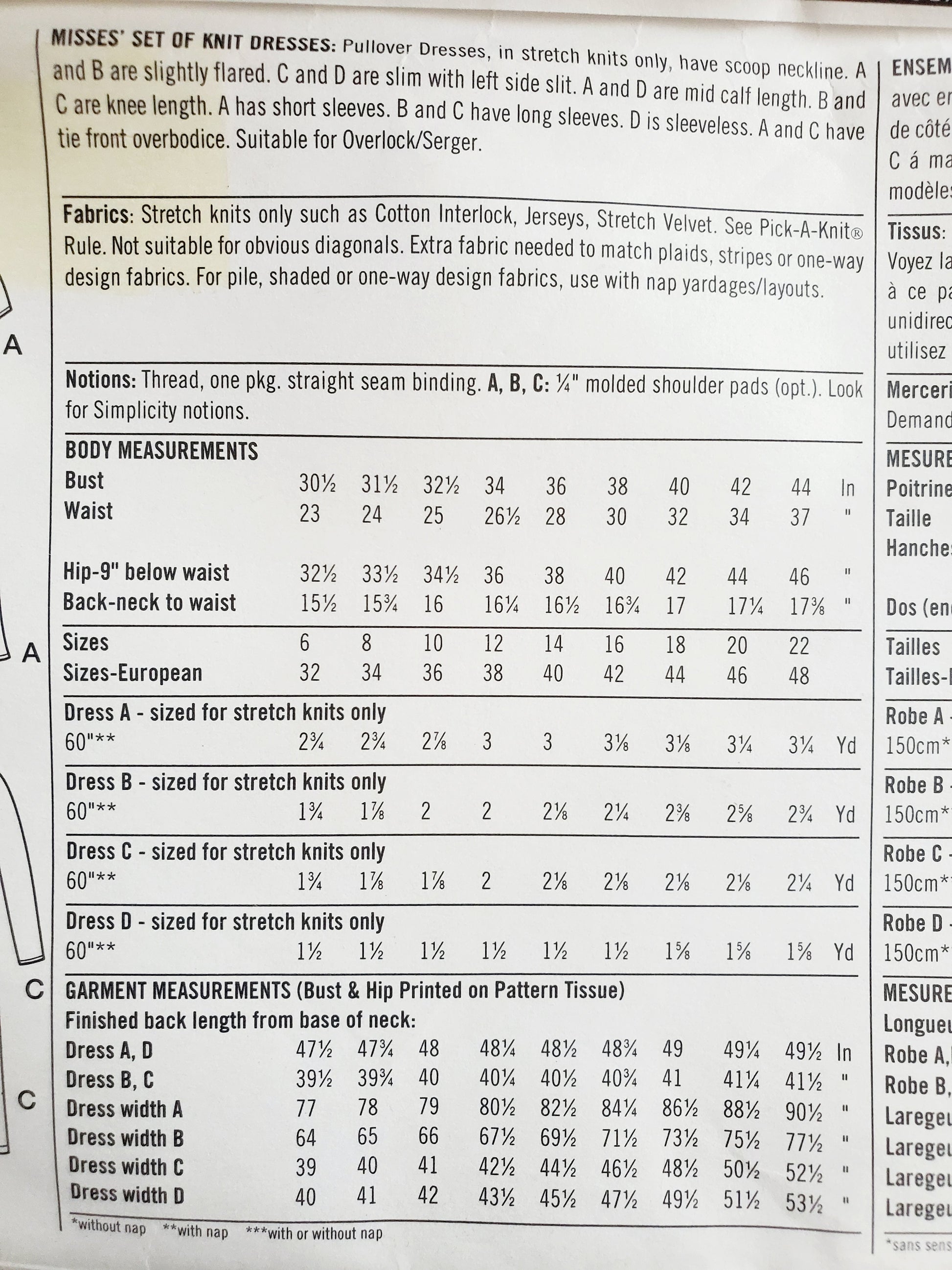 MISSES' SET OF KNIT DRESSES (Sized for Stretch Knits Only): Pullover dresses have scoop neckline. A and B are slightly flared. C and D are slim with left side slit. A and D are mid-calf length. B and C are knee length. A has short sleeves. B and C have long sleeves. D is sleeveless. A and C have tie front over bodice. Suitable for Overlock/Serger.
